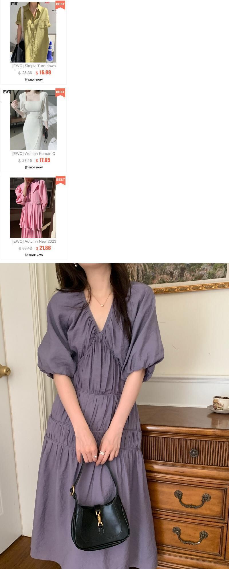 [EWQ] V ネックプリーツパープルドレスパフスリーブスリムフィット気質ドレス夏潮 16U162 サマー 夏物 Vネック