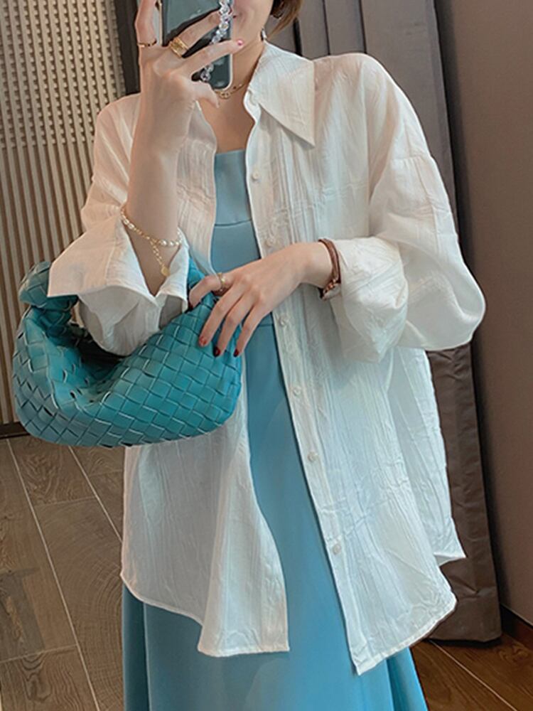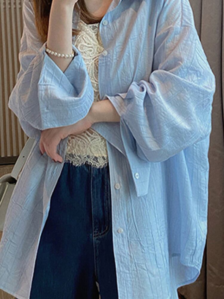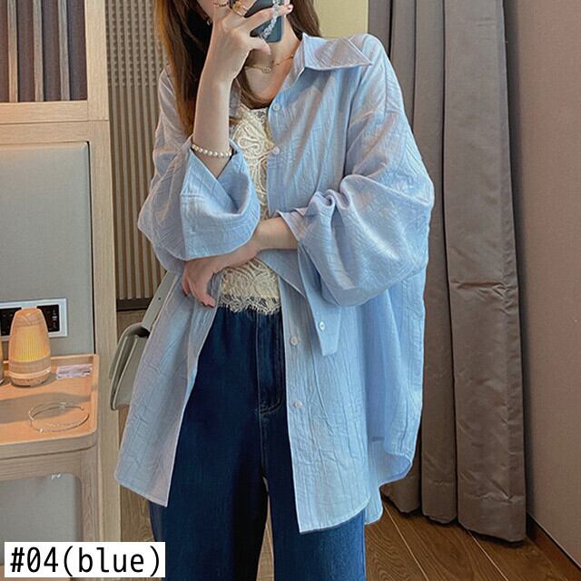 [EWQ] シングルブレストシャツ ブルー 長袖 ルーズ フィット 薄手 夏 タイドラペル トップス 16U377 ロング サマー 夏物