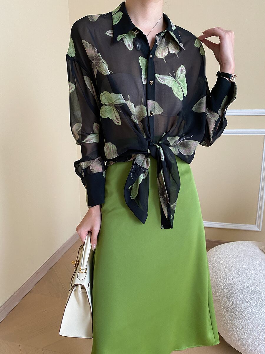 [EWQ] プリントルーズシャツ長袖コントラストシングルブレストラペル秋視点トップス ロング オータム 秋物