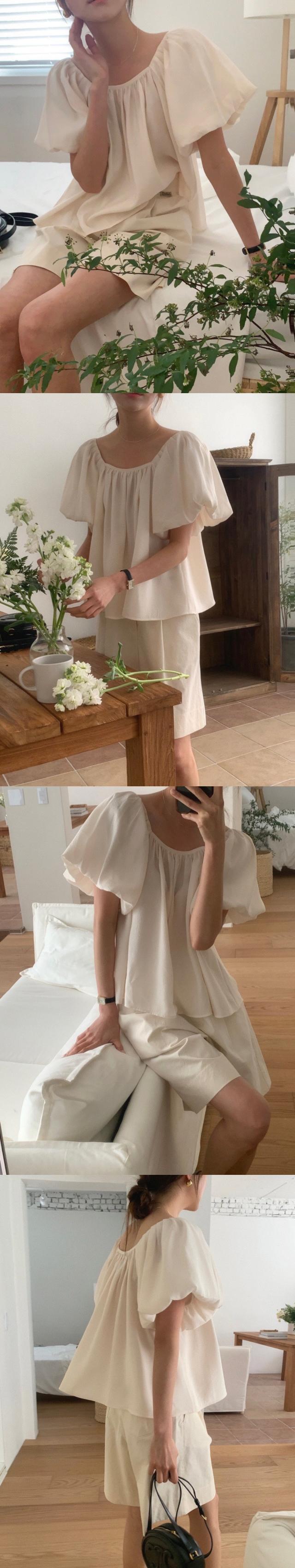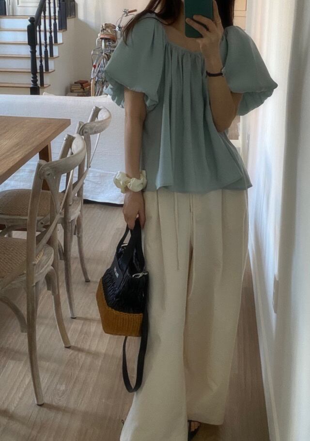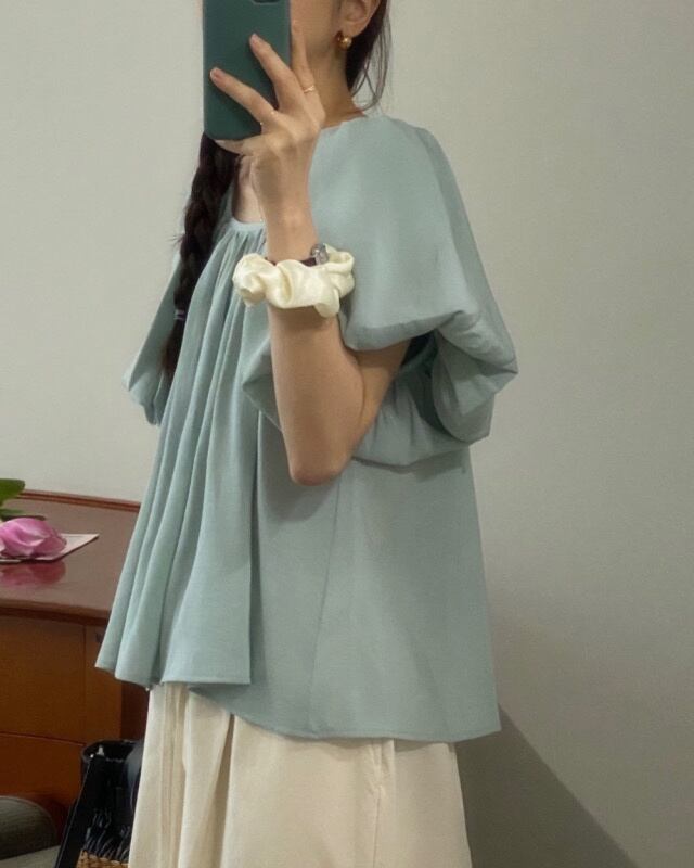 [EWQ] バブルスリーブシャツソリッドカラールーズフィット O ネックひだブルーサマータイドトップ 6U435 夏物 Oネック