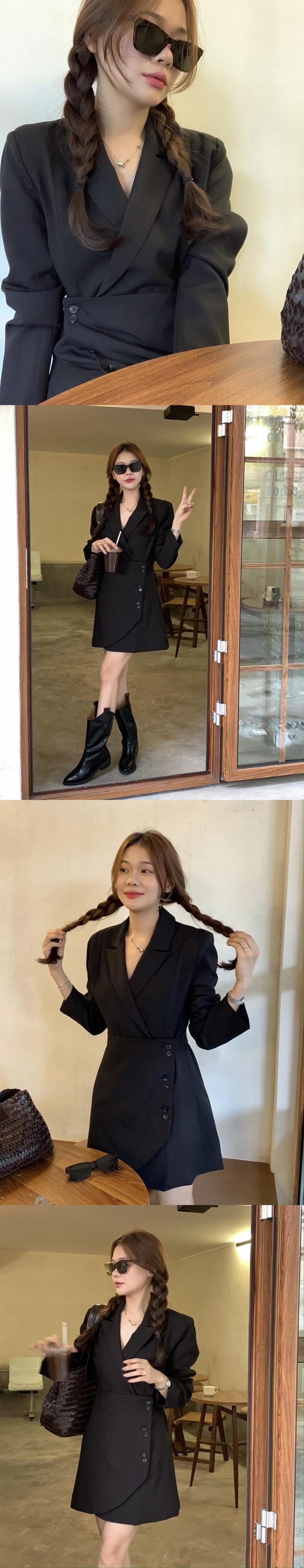 [EWQ] ラペルスーツドレスサイドシングルブレストウエスト長袖ショートドレス夏潮 Vestidos ロング サマー 夏物