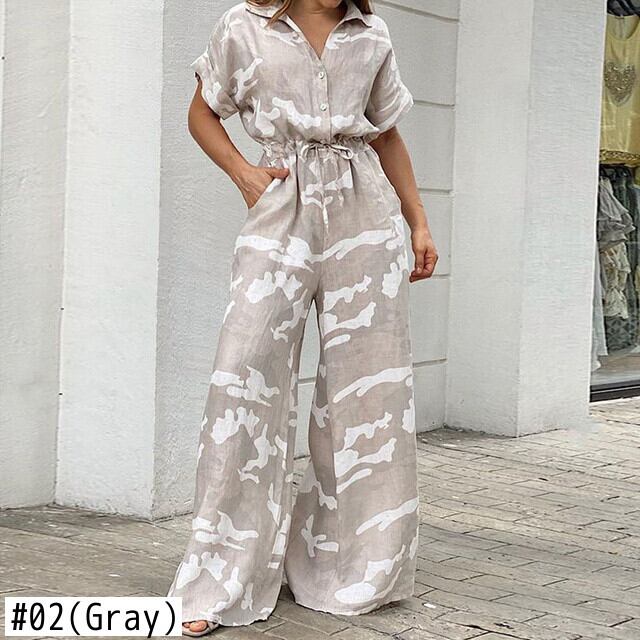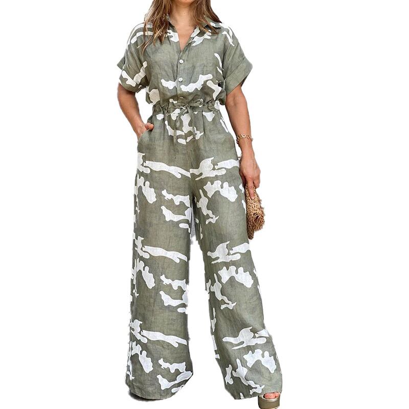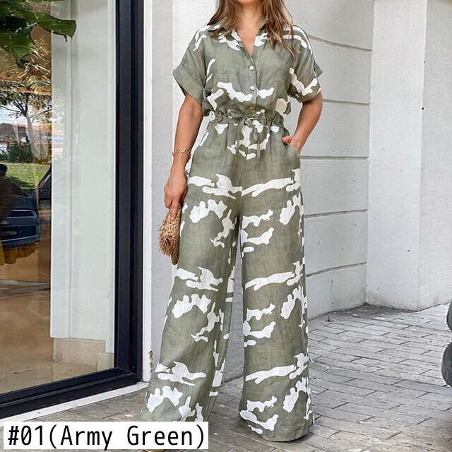 [EWQ] プリントボタンレースアップジャンプスーツ迷彩コントラストストリート半袖ワイドレッグジャンプスーツ夏 ショート ハーフスリーブ サマー 夏物 ワイドパンツ