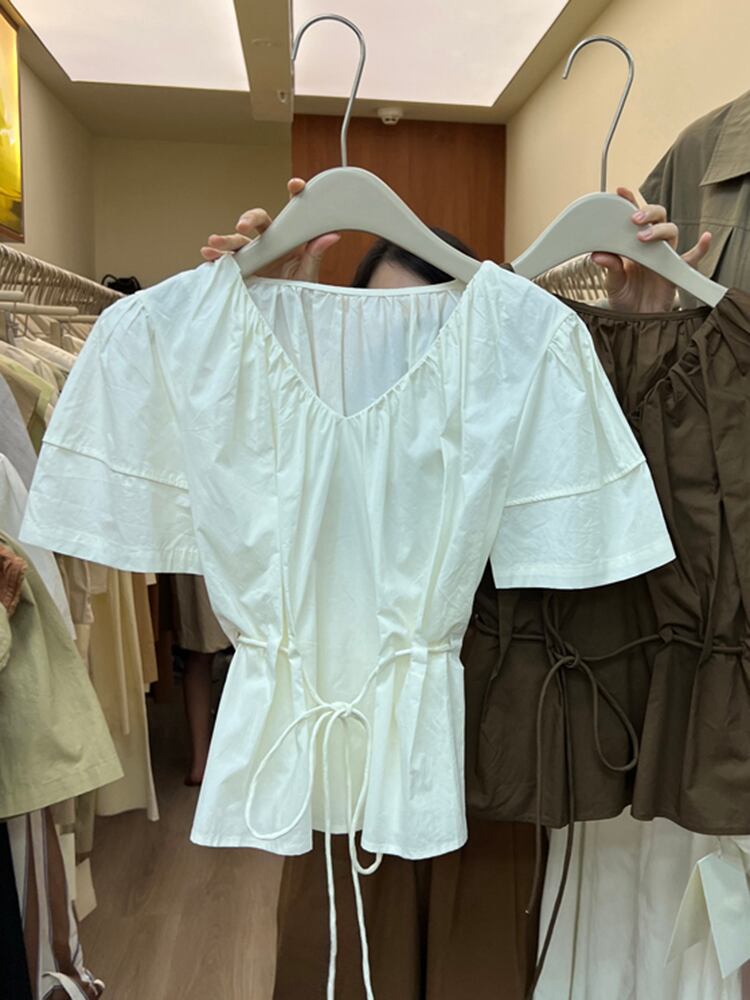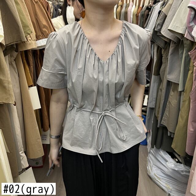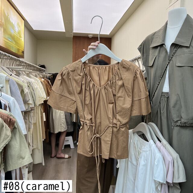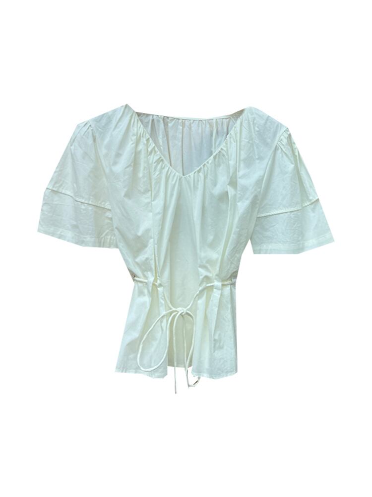 [EWQ] V ネック プリーツ シャツ レディース 半袖 巾着 ゆったり 夏潮イエロー トップス U841 ショート ハーフスリーブ サマー 夏物 Vネック