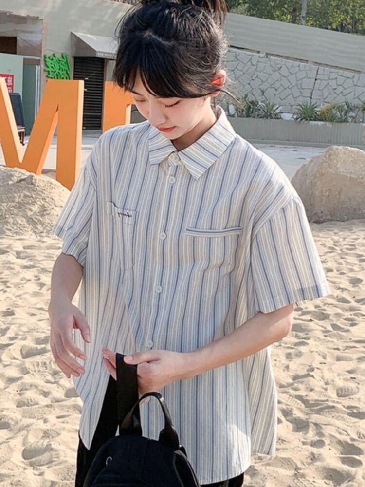 [EWQ] ホワイトブルーストライプシャツ半袖ルーズシングルブレストポケットレターサマータイドトップ U808 ショート 夏物