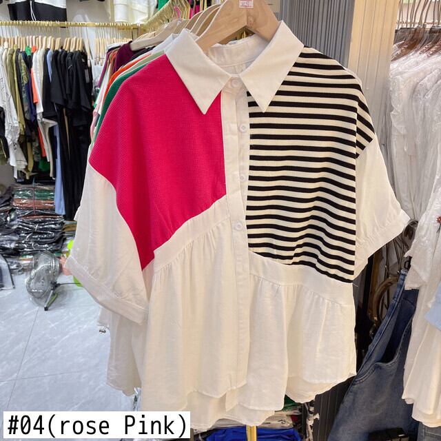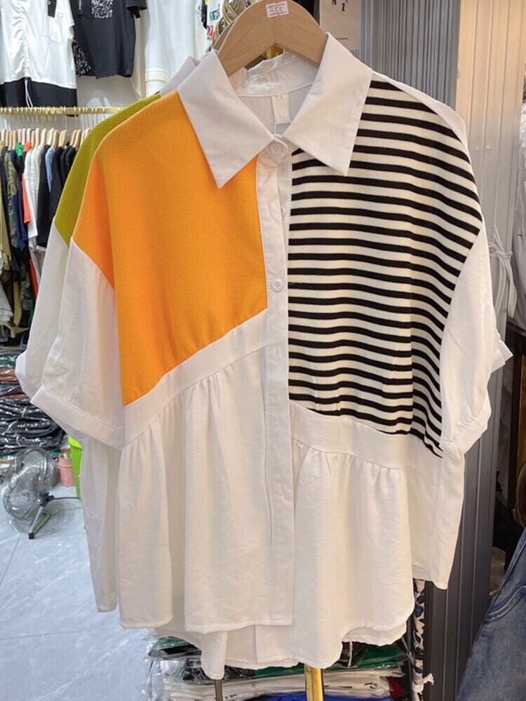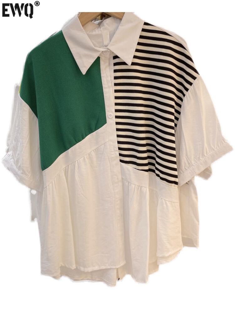 [EWQ] 不規則定色パッチワークスプライスシャツラペル半袖ルーズブラウスレディース夏 ショート ハーフスリーブ サマー 夏物