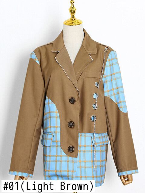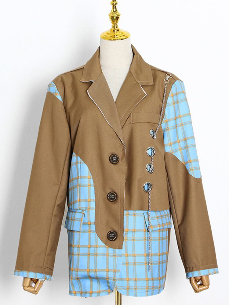 [EWQ] チェック柄ストリートブレザーコートチェーン装飾長袖ルーズパッチワークスーツジャケット秋 ロング オータム 秋物