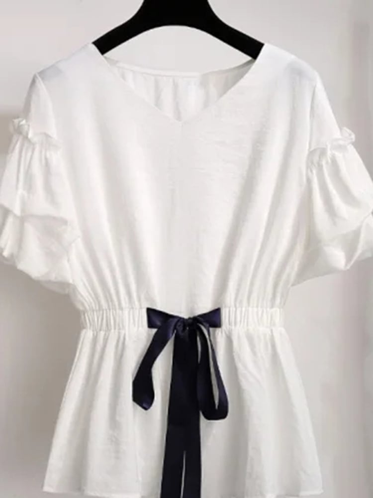 [EWQ] ウエストゴムレースアップ Tシャツフリルパッチワーク半袖ブルー Tシャツ夏潮 Tシャツ 6U708 ショート ハーフスリーブ エラスティック 伸縮 サマー 夏物