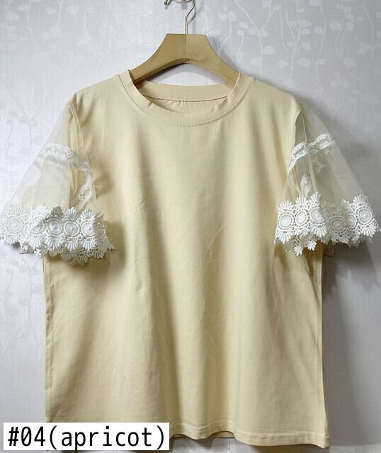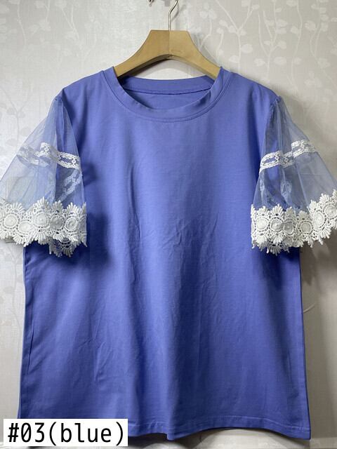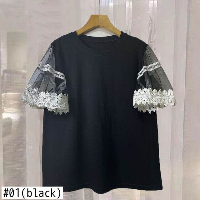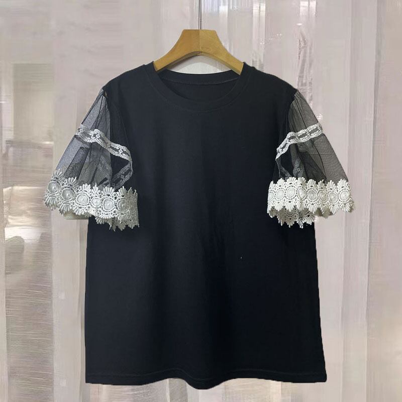[EWQ] レース透視フライスリーブパッチワーク Tシャツ O ネックルーズブラウス夏トレンド サマー 夏物 Oネック