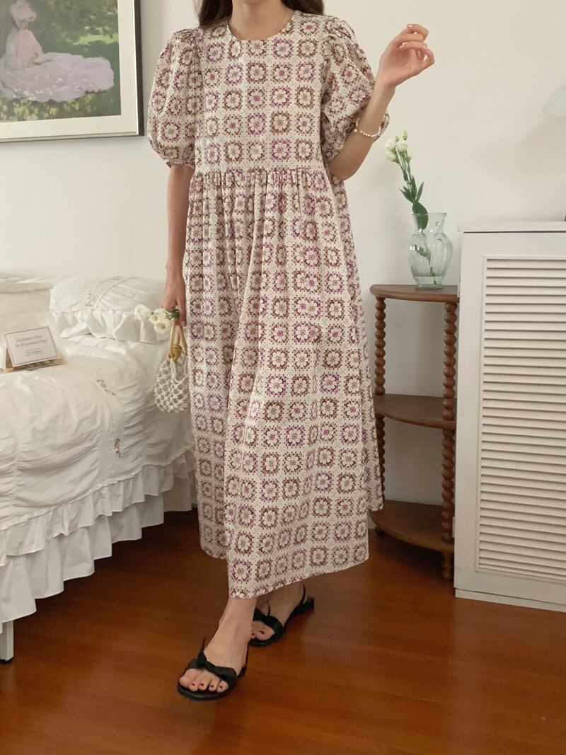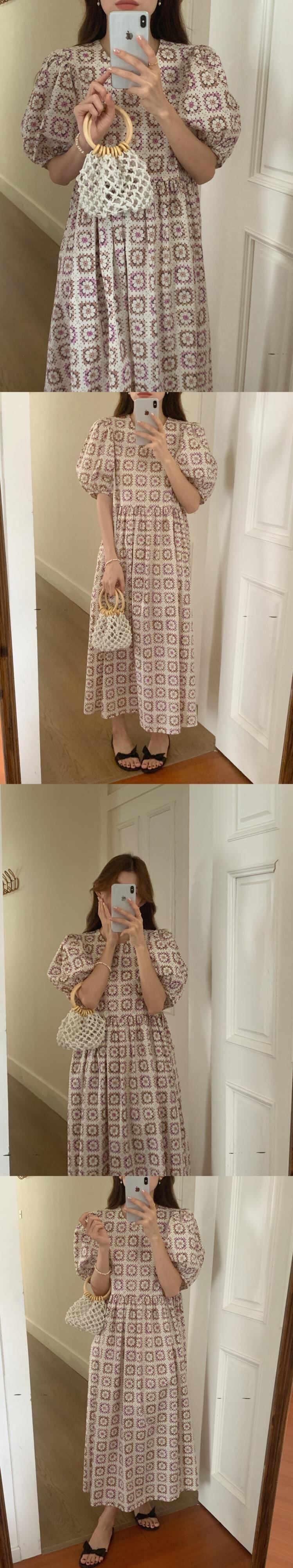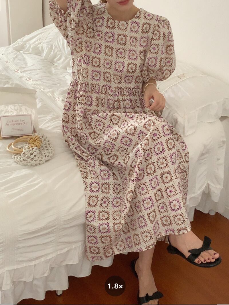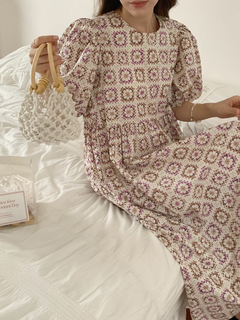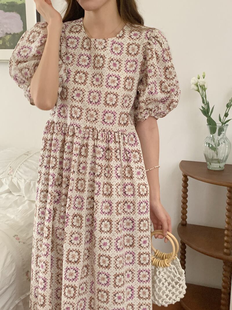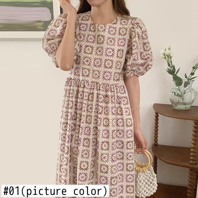 [EWQ] フラワープリントドレスパフスリーブコントラストカラー O ネックドレス夏潮 Vestidos サマー 夏物 Oネック フラワーデザイン