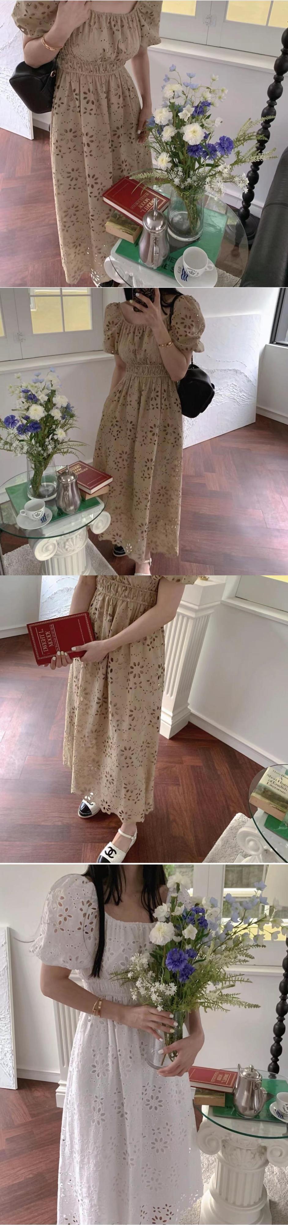 [EWQ] フックフラワー中空パフスリーブドレスルーズソリッドスクエアカラー Vestidos 夏潮 16U745 サマー 夏物 ソリッドカラー フラワーデザイン スクウェア
