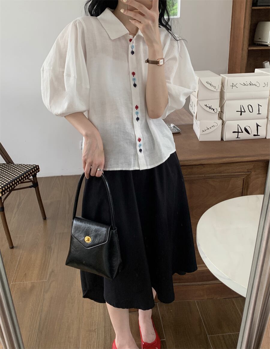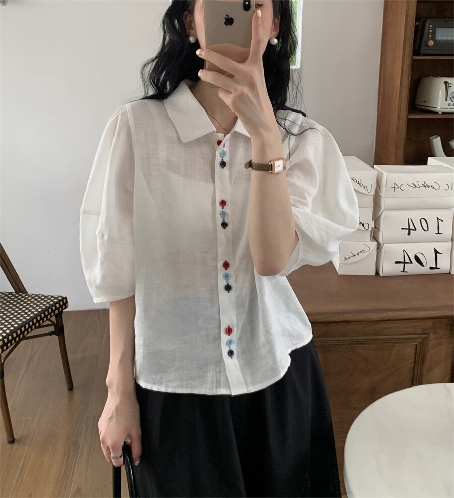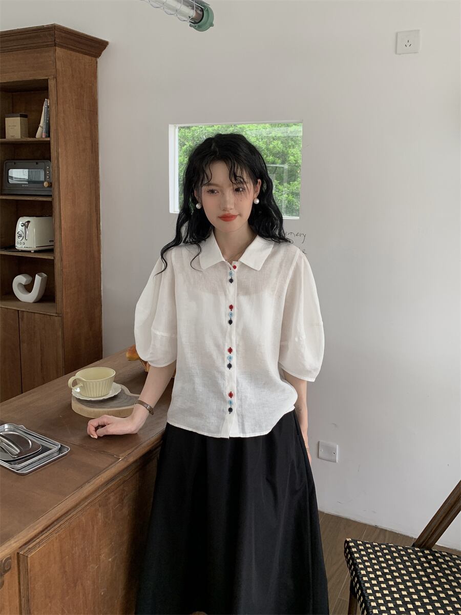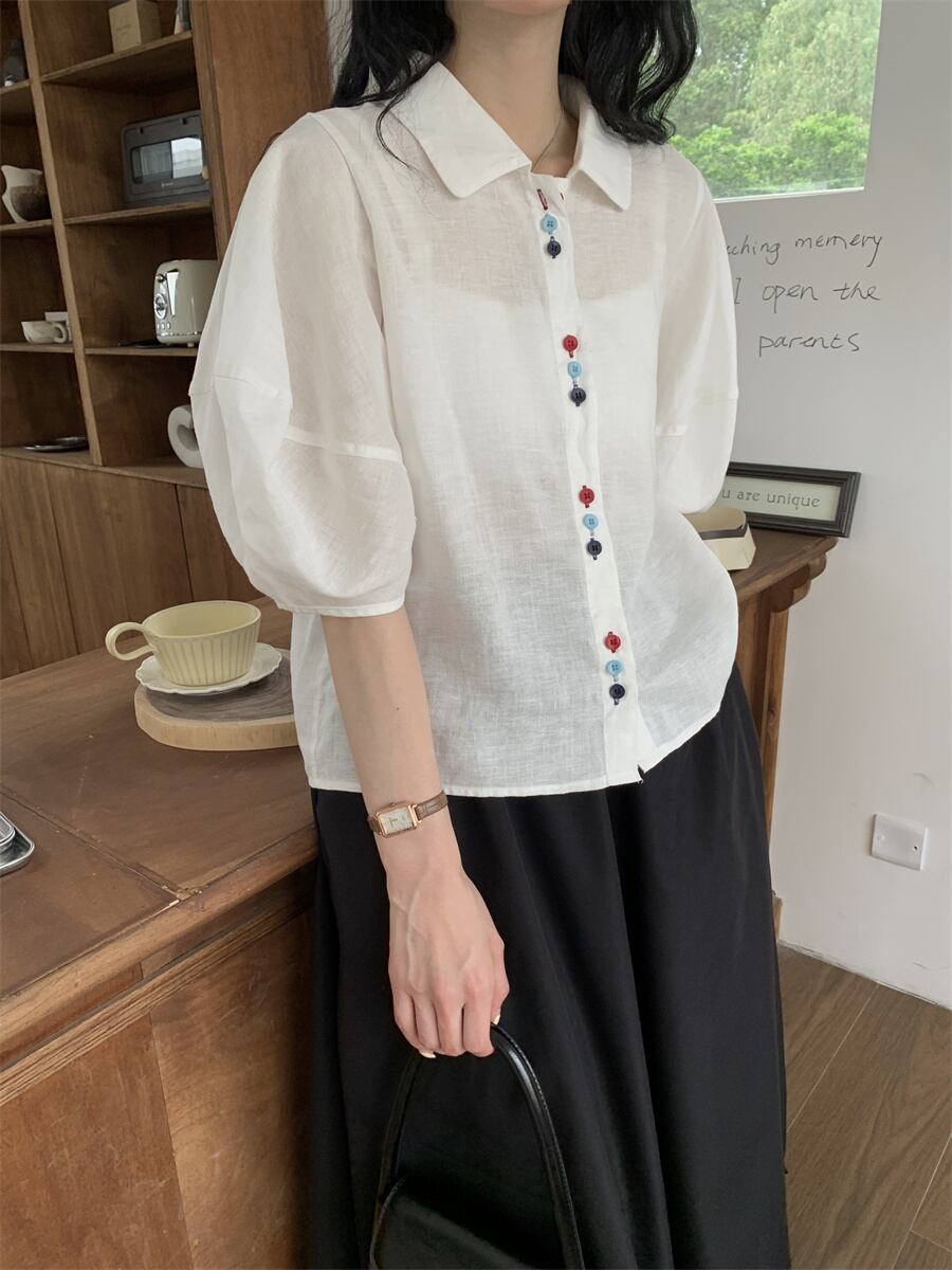 [EWQ] カラフルボタンシャツ白ルーズフィットパフスリーブシングルブレスト夏潮トップ ホワイト サマー 夏物