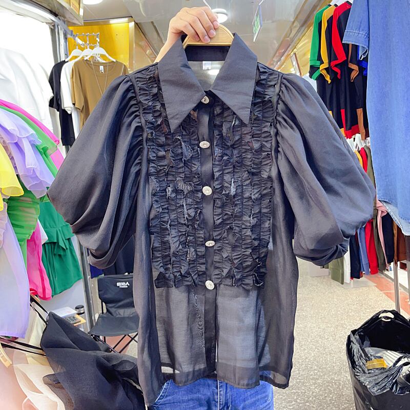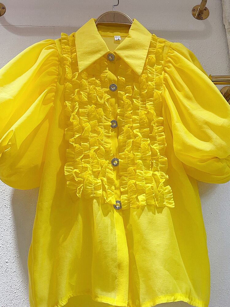 [EWQ] 甘いパフスリーブフリルスプライスシャツラプルシングルブレストルーズブラウストップ夏使えるグリーントップス 大人ガーリー スウィート キュート カジュアル サマー 夏物