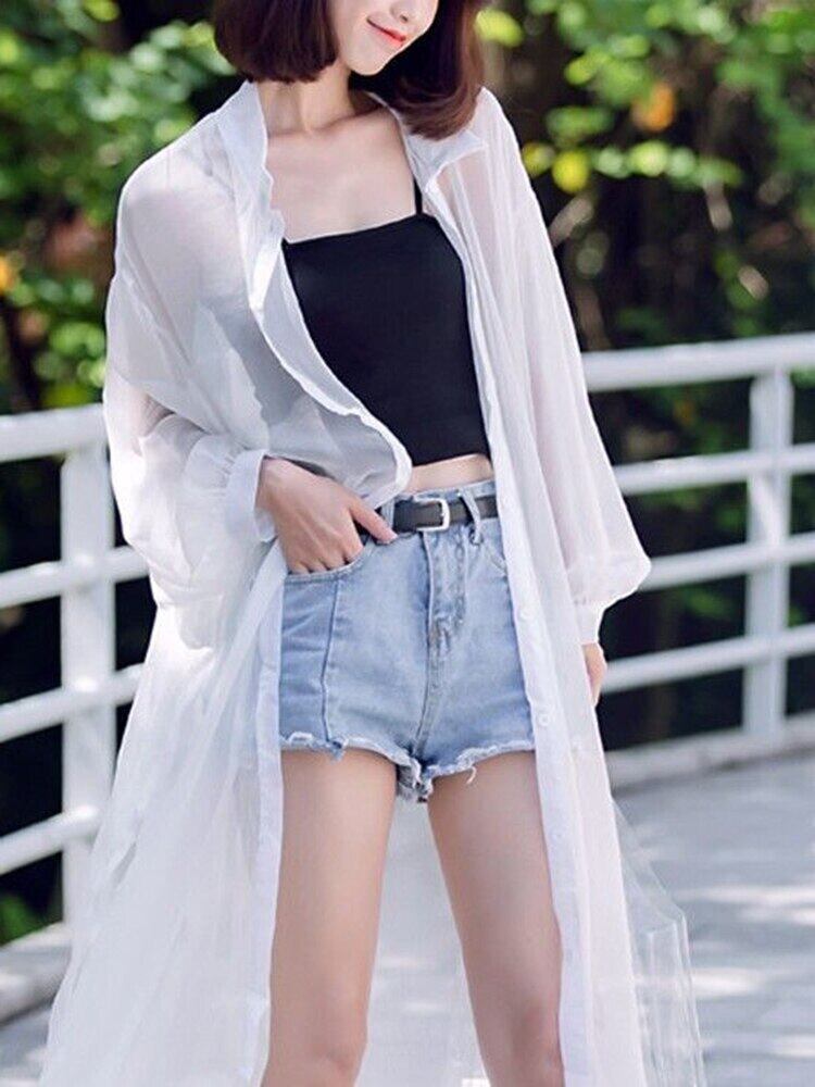 [EWQ] 白薄手シャツ長袖 Tperspective 夏服潮オープンステッチルーズシャツ 66 ロング ホワイト サマー 夏物