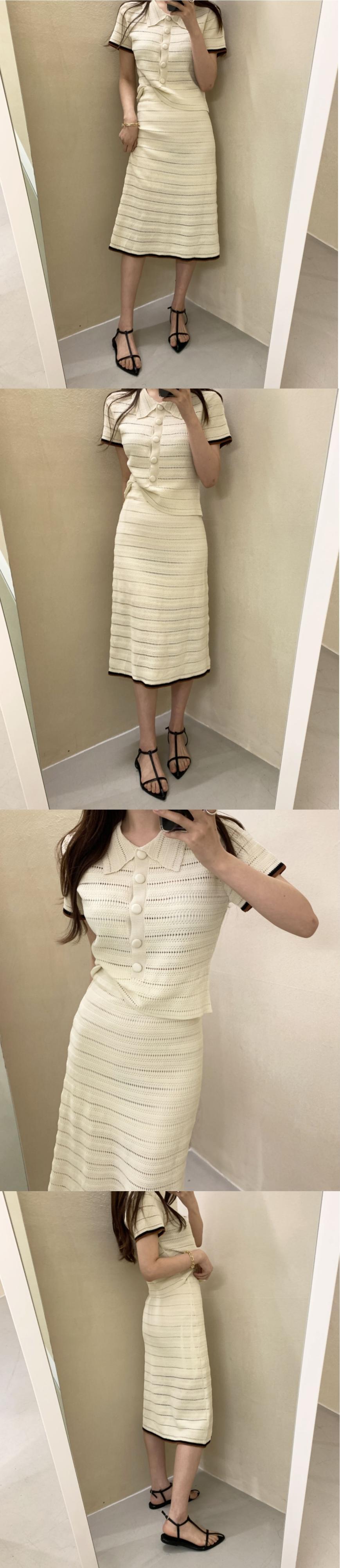 [EWQ] 中空アウトジャカードニットスーツコントラストカラー半袖シャツ + ウエストミッドふくらはぎスカート夏潮 ショート ハーフスリーブ サマー 夏物