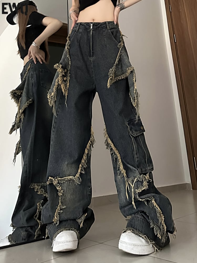 [EWQ] ストリートデニムパンツ夏潮ウエストパッチワークバリポケットボタン装飾ジーンズ 16U681 サマー 夏物