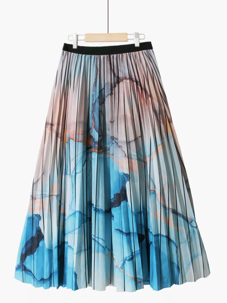 [EWQ] オイルペイントフラワープリーツスカートウエスト弾性タイダイプリントコントラストスカート夏オールマッチ服 エラスティック 伸縮 サマー 夏物 フラワーデザイン