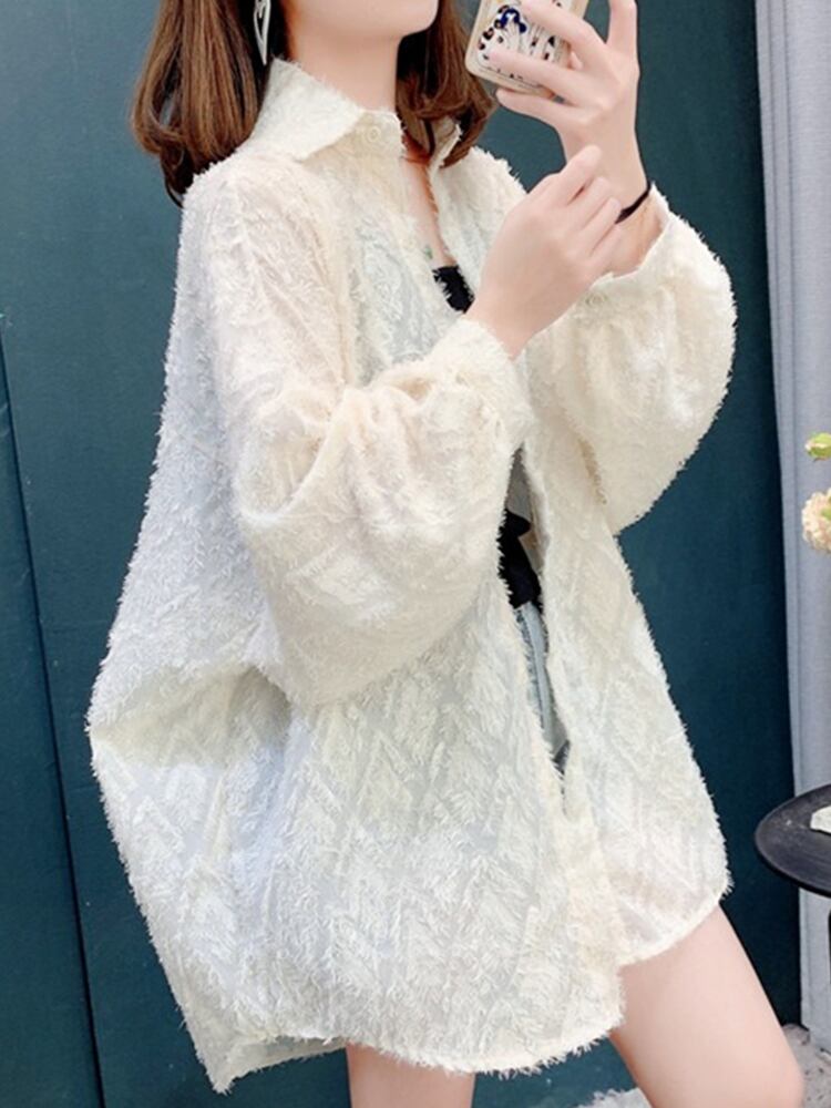 [EWQ] 白シャツフックフラワーテル薄いシングルブレストルーズ長袖ブラウス秋トップ ロング ホワイト オータム 秋物 フラワーデザイン