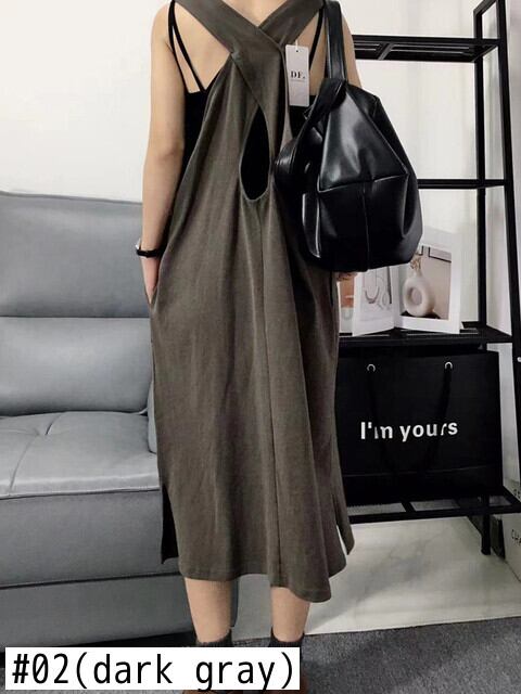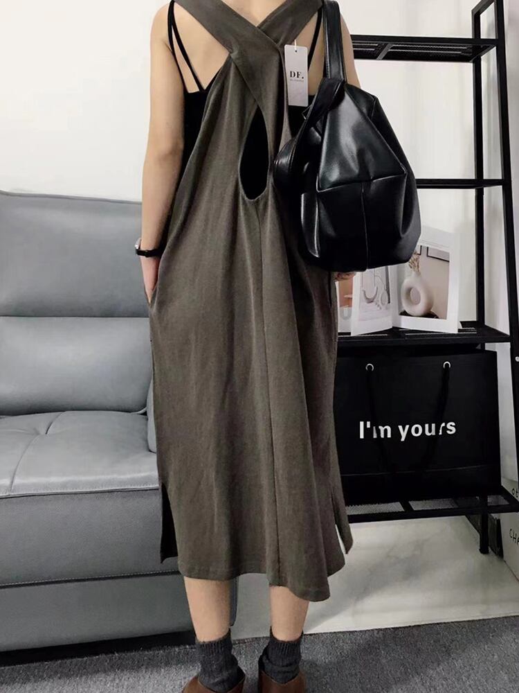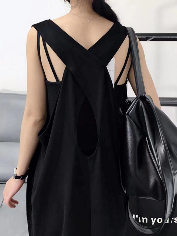 [EWQ] クロスバックローネックノースリーブベストドレスルーズフィットソリッドカラードレス夏潮 Vestido サマー 夏物