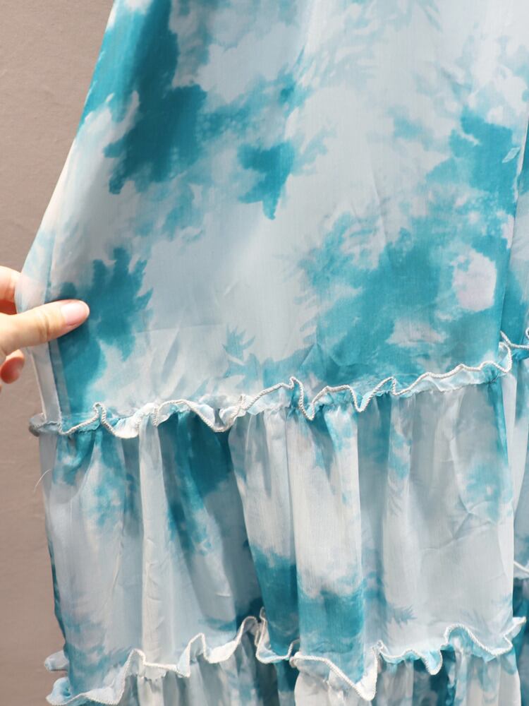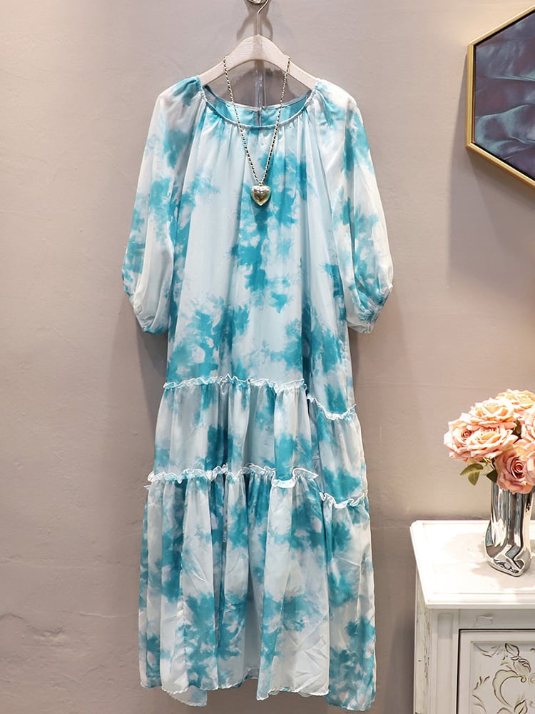 [EWQ] タイダイ パフ スリーブ シフォン ドレス 気質ランタン スリーブ フリル パッチワーク ドレス 夏潮 ランタンスリーブ サマー 夏物