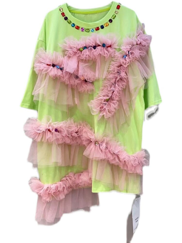 [EWQ] ダイヤモンド O ネック Tシャツメッシュパッチワークコントラストカラールーズ半袖 Tシャツトップ夏潮 Tシャツ 76 ショート ハーフスリーブ サマー 夏物 Oネック