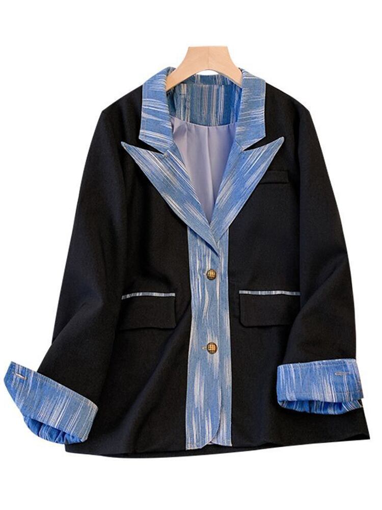 [EWQ] デニムパッチワークコントラストブレザーコート長袖オーバーサイズルーズスーツジャケット秋潮ブレザー ロング オータム 秋物