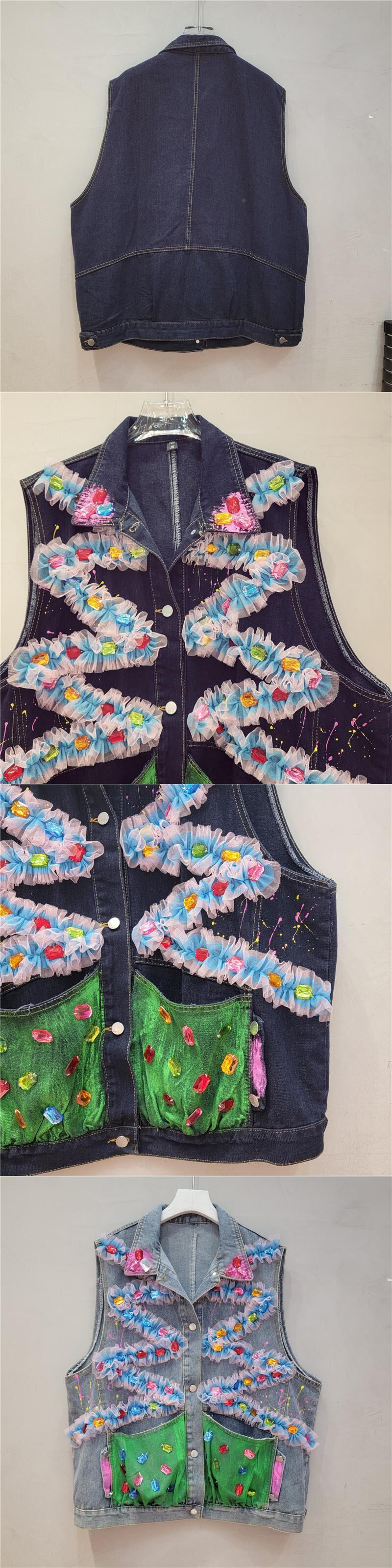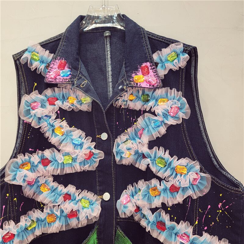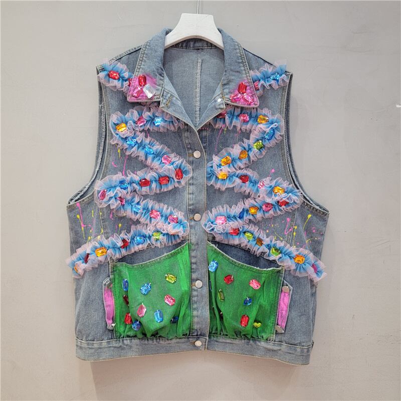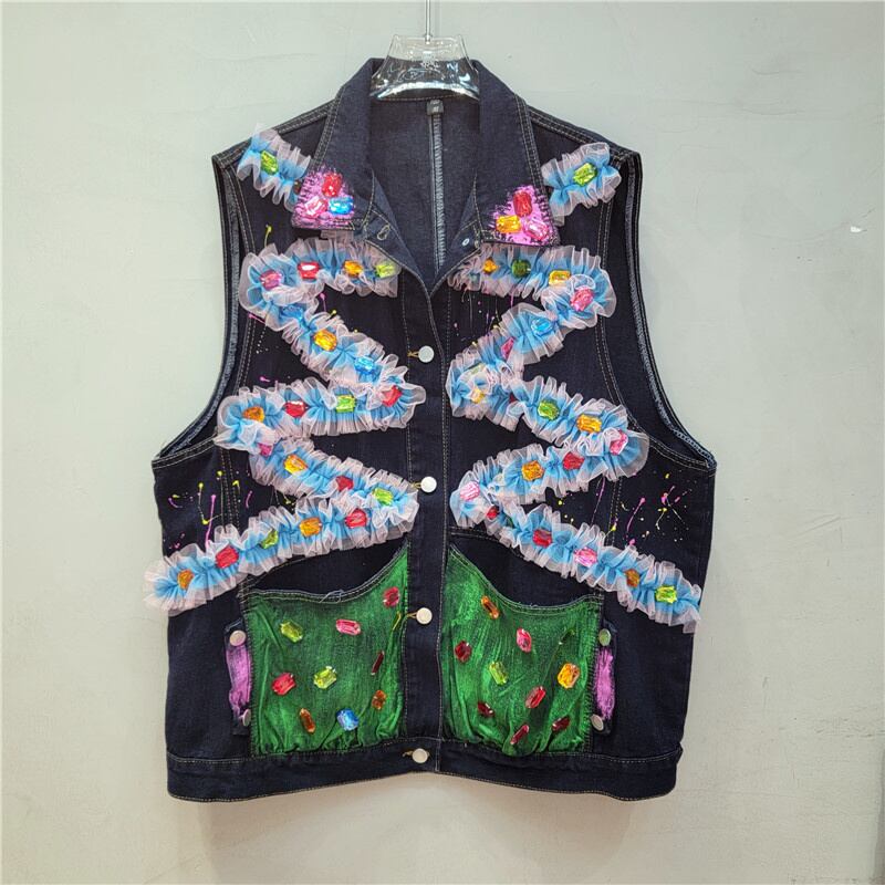 [EWQ] グラフィティポケット装飾ベストメッシュコントラストパッチワークルーズノースリーブジャケット夏潮ストリートトップ サマー 夏物