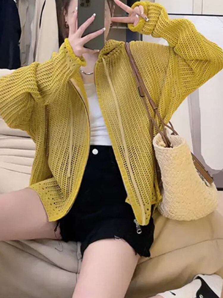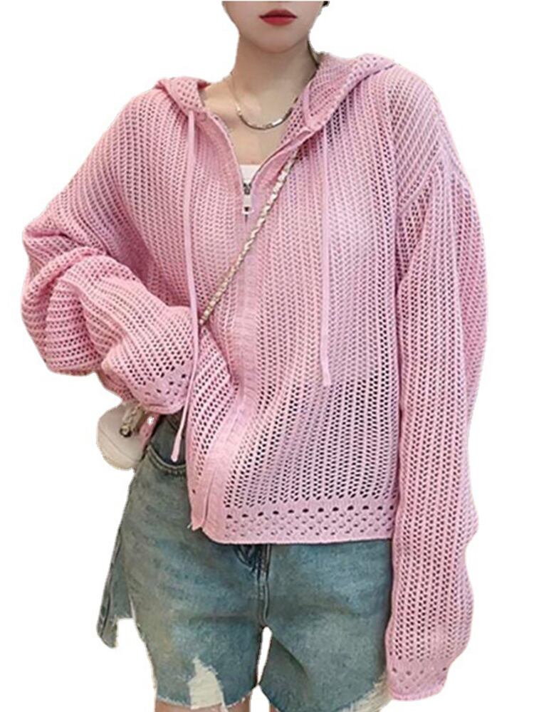[EWQ] 中空フード付きニットジャケット 薄い秋ジッパー装飾ジャケット コート ルーズ パープル 長袖 アウター ロング オータム 秋物