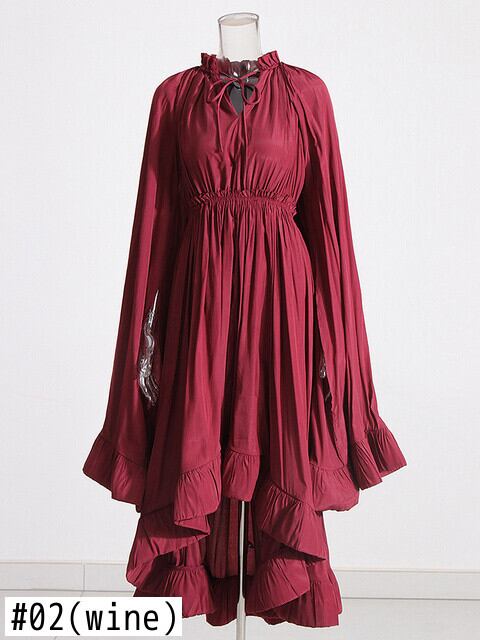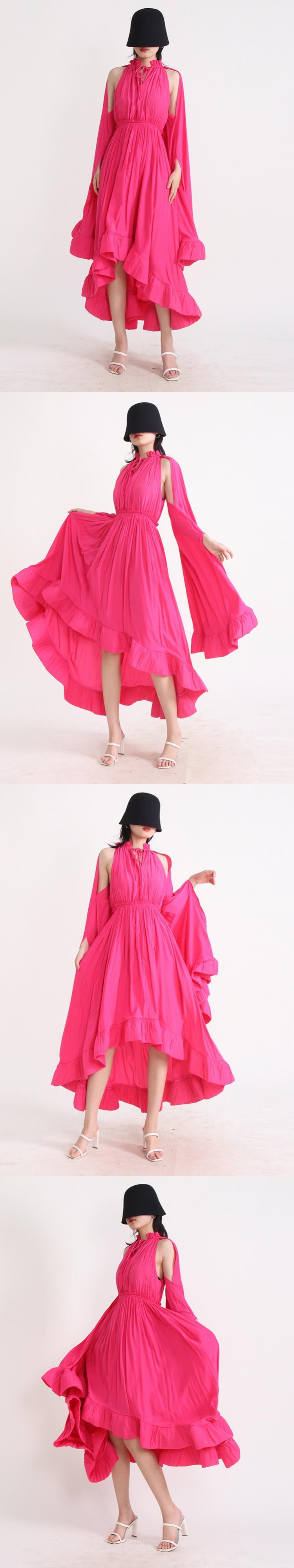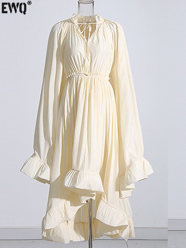 [EWQ] ミニマリストドレス V ネックマントスリーブウエストフリル不規則サマードレス Vestido 16U718 ラッフル 夏物 Vネック