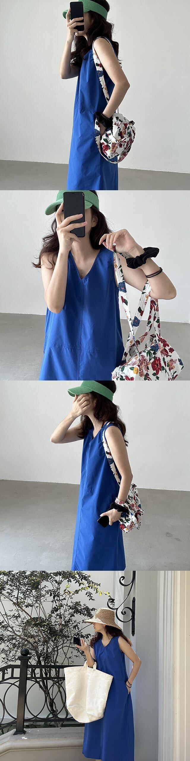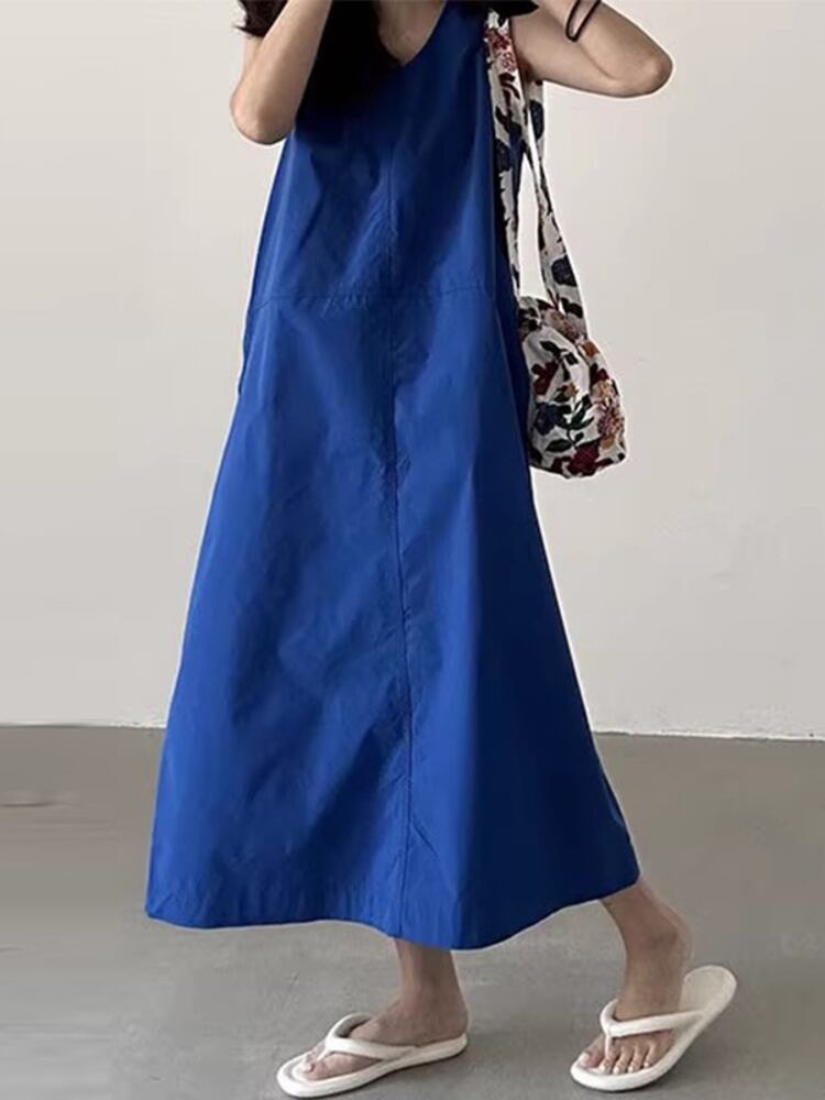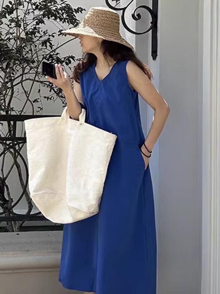 [EWQ] シンプルブルーベストドレス V ネック折り目ルーズフィットポケットノースリーブドレス夏潮ローブ サマー 夏物 Vネック