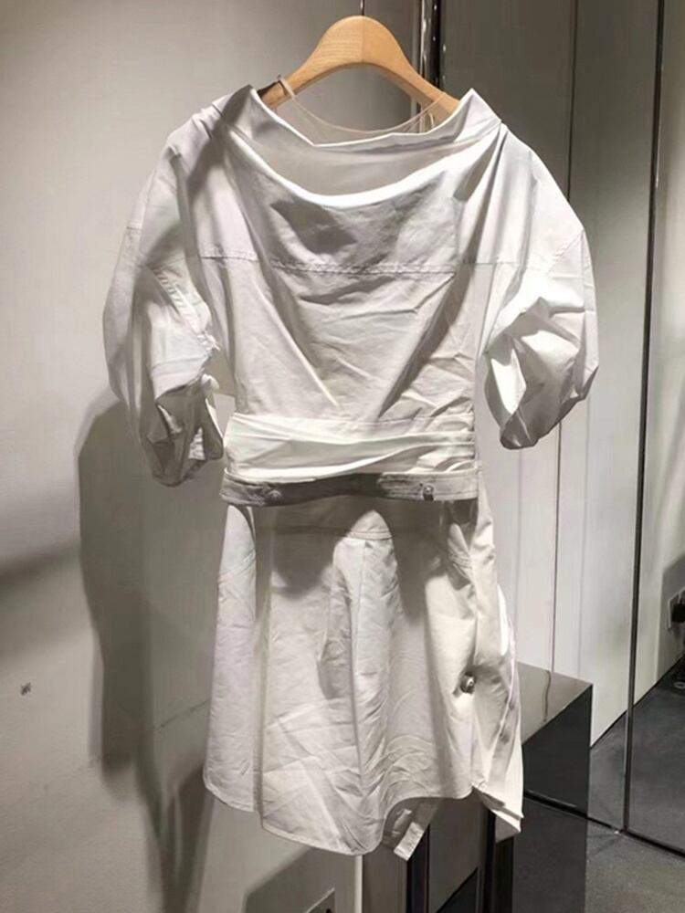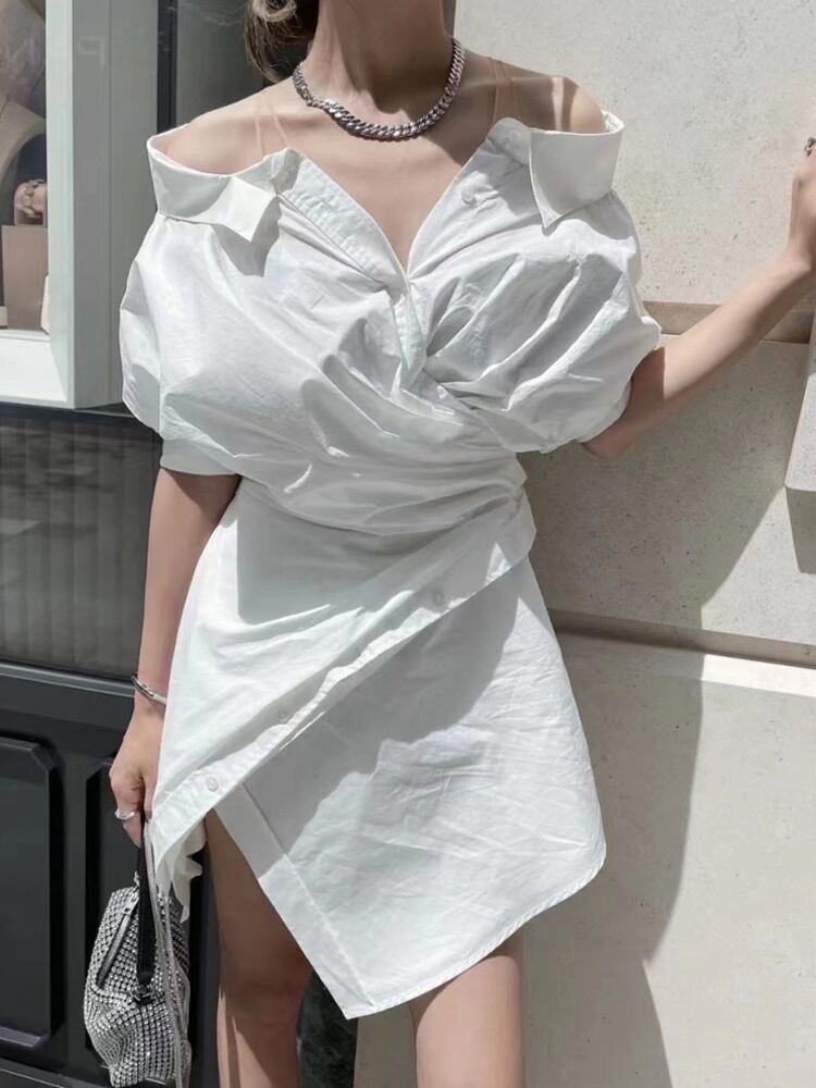 [EWQ] シャツドレス V ネック長袖オフショルダー不規則ストライプミニドレス夏 Vestido 16U977 ロング サマー 夏物 Vネック
