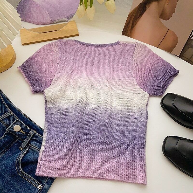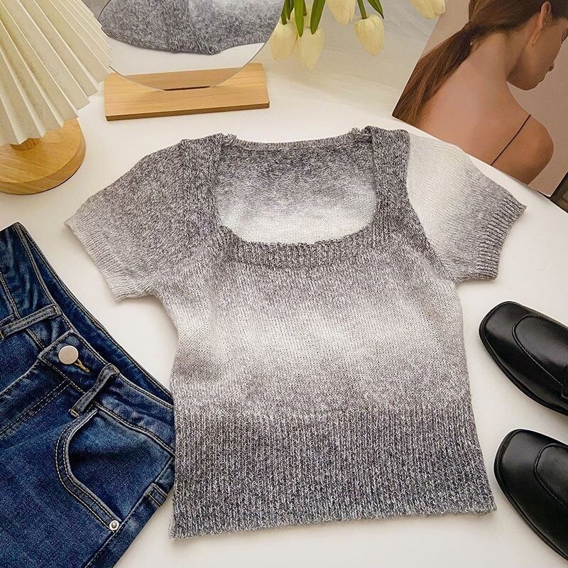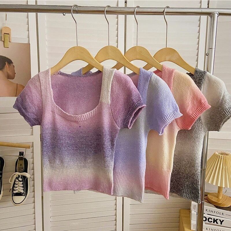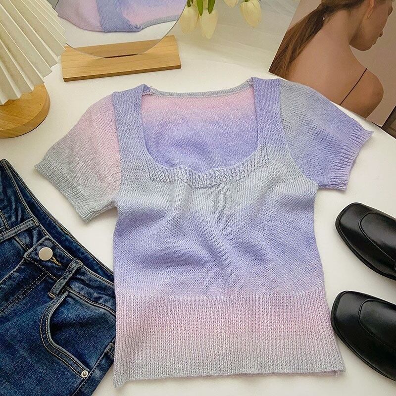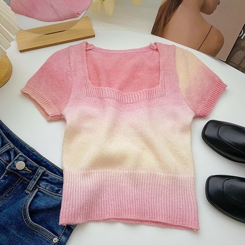 [EWQ] グラデーションコントラストニット Tシャツ甘いピンクスクエアネックスリムフィット半袖夏潮 T シャツ ショート ハーフスリーブ 大人ガーリー スウィート キュート カジュアル サマー 夏物 スクウェア