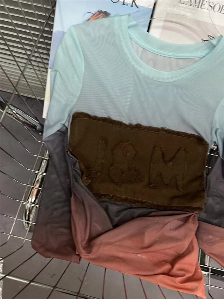 [EWQ] レターパッチワーク Tシャツグラデーションガーゼ遠近 Tシャツトップストリートスリム長袖秋薄い Tシャツ ロング オータム 秋物