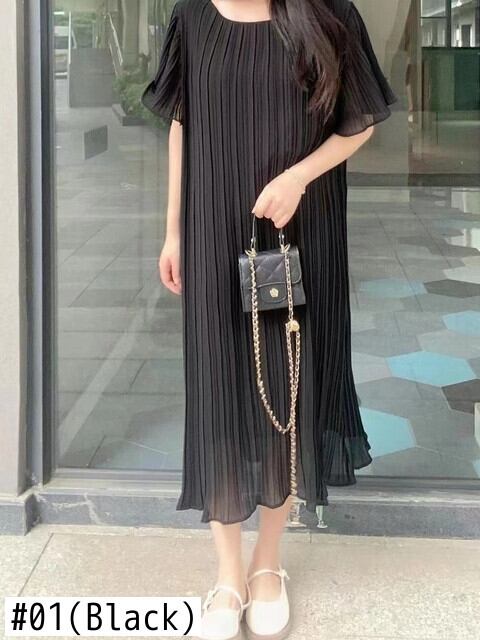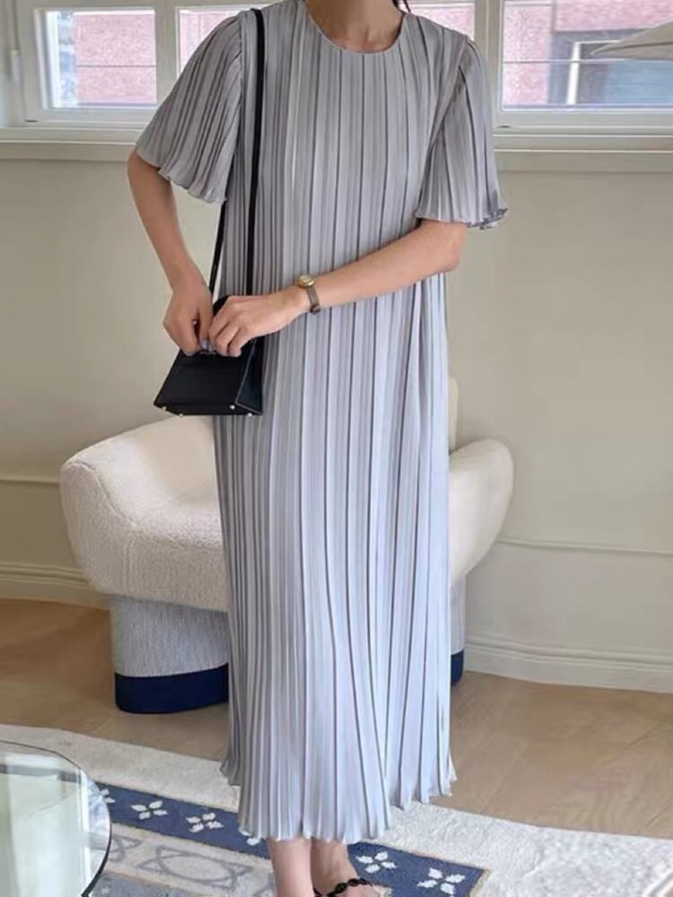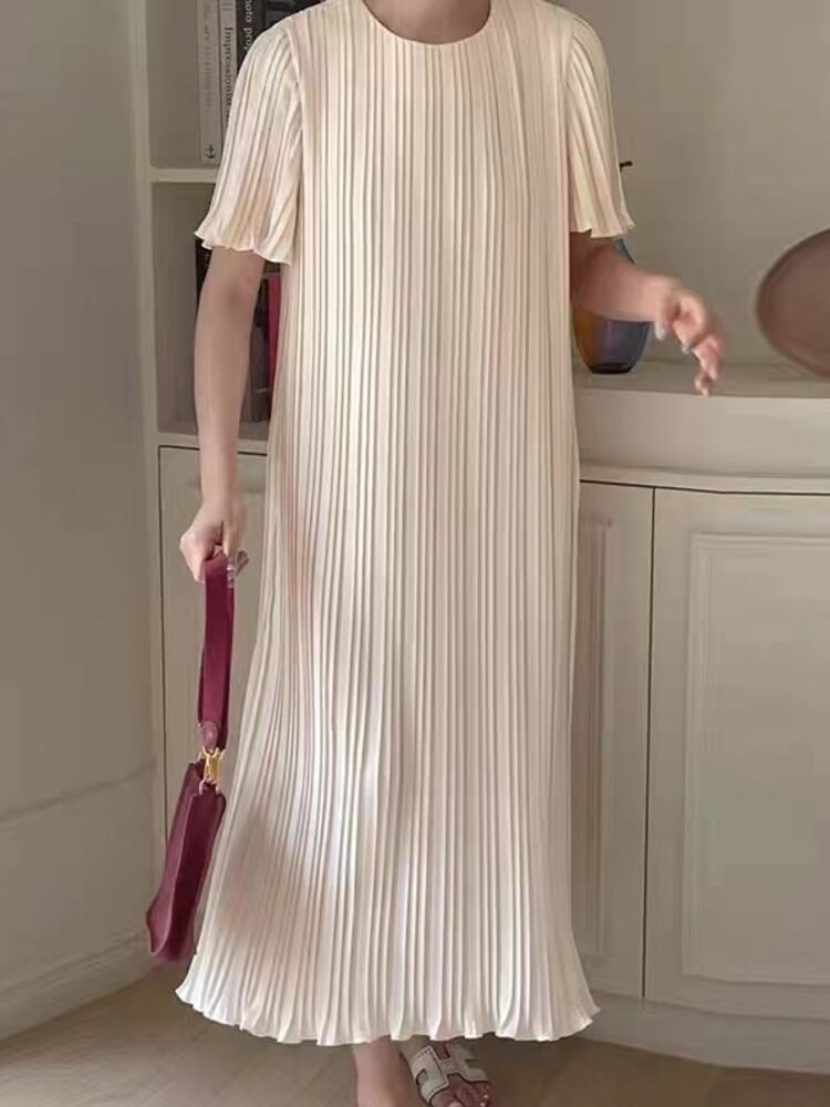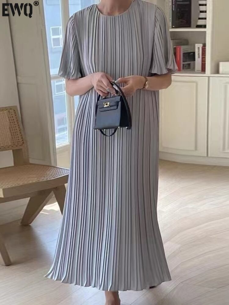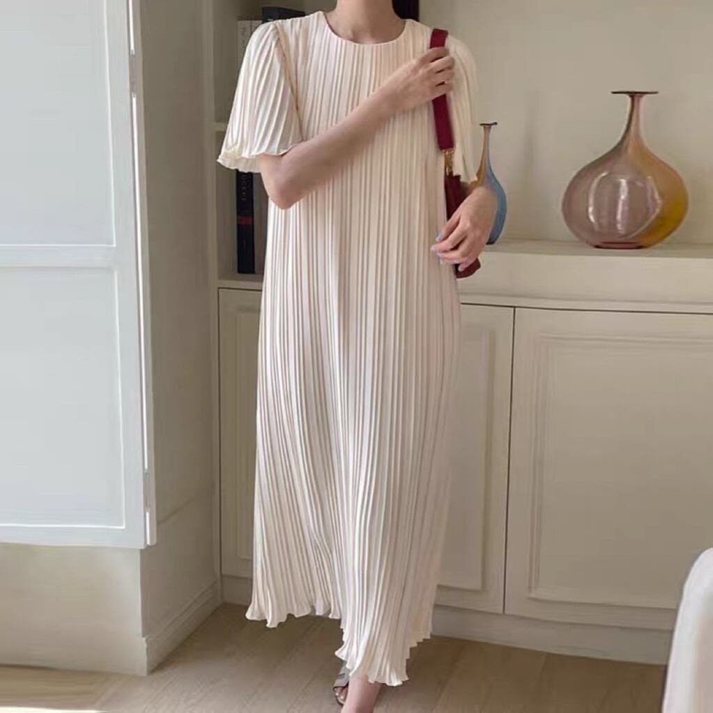 [EWQ] O ネックプリーツドレス夏潮半袖ルーズフィット因果ひだドレス Vestido ショート ハーフスリーブ サマー 夏物 Oネック