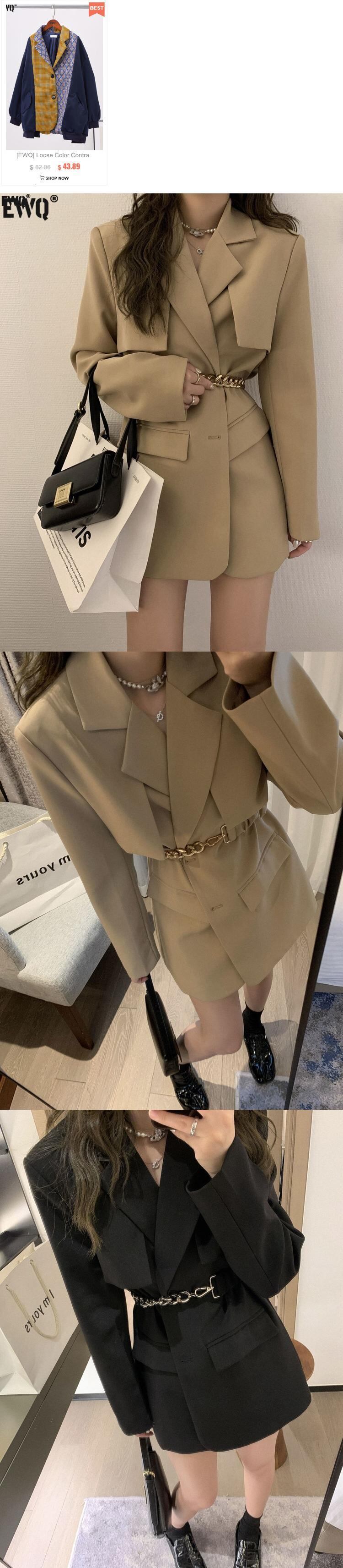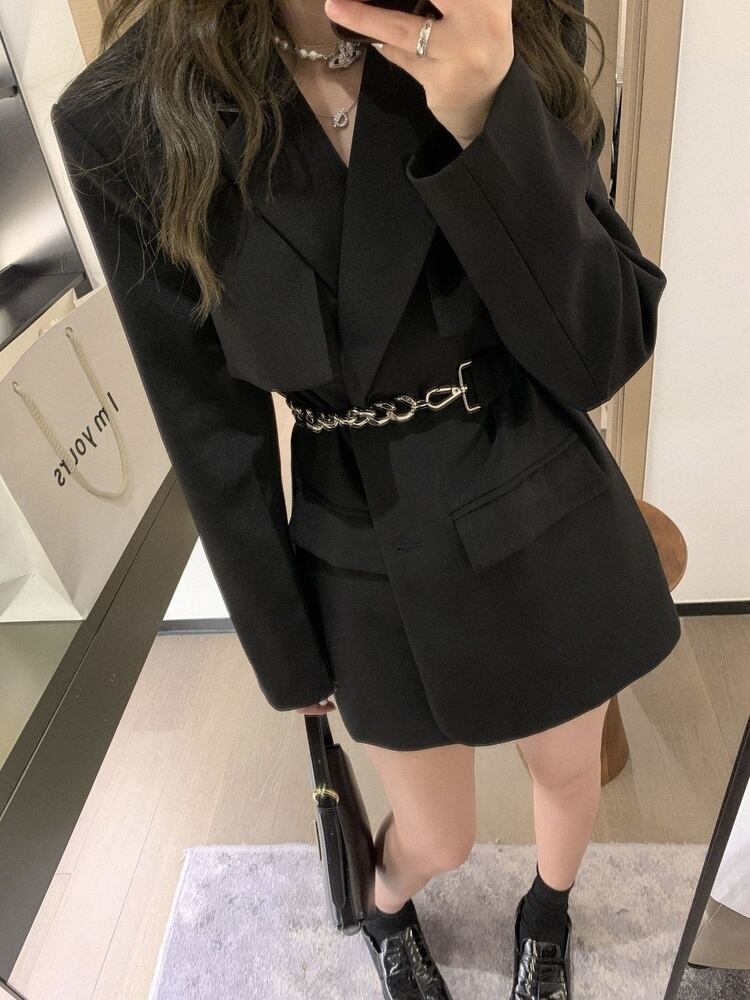 [EWQ] レディース ノッチカラー長袖ソリッドブレザー秋スプライスチェーンスリムブレザー ロング オータム 秋物 ソリッドカラー