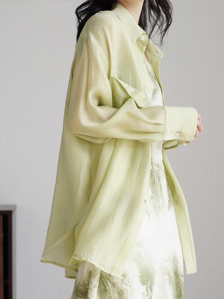 [EWQ] レディース グリーン 薄手 シャツ 長袖 ルーズ カジュアル オーバーサイズ ブラウス トップ 夏潮 シングルブレスト ロング サマー 夏物