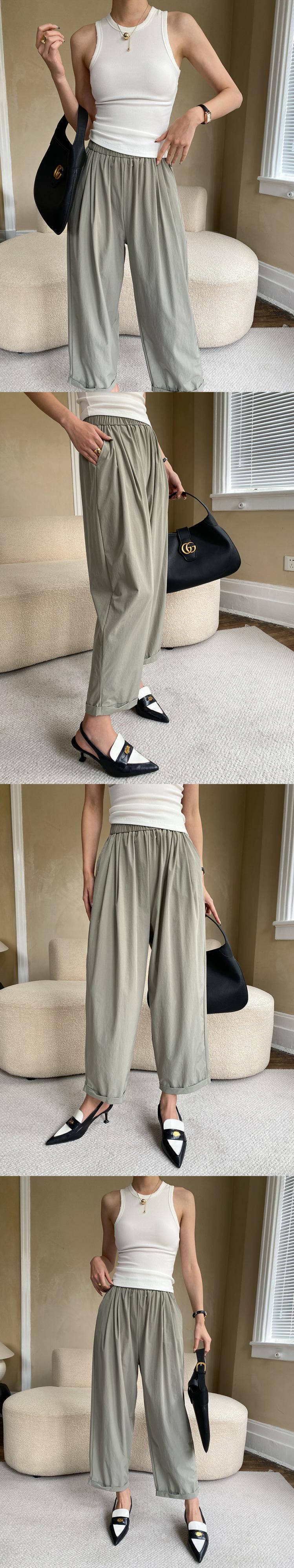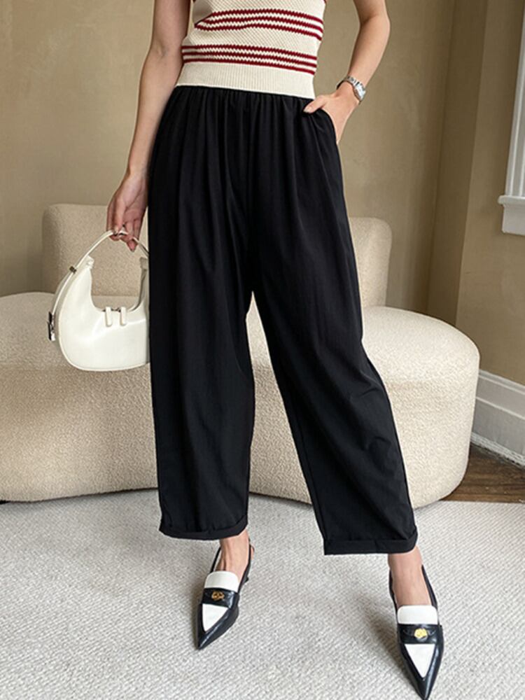 [EWQ] プリーツ弾性ウエストワイドレッグパンツポケットワイドウエストカールパンツ秋トレンド エラスティック 伸縮 オータム 秋物 ワイドパンツ