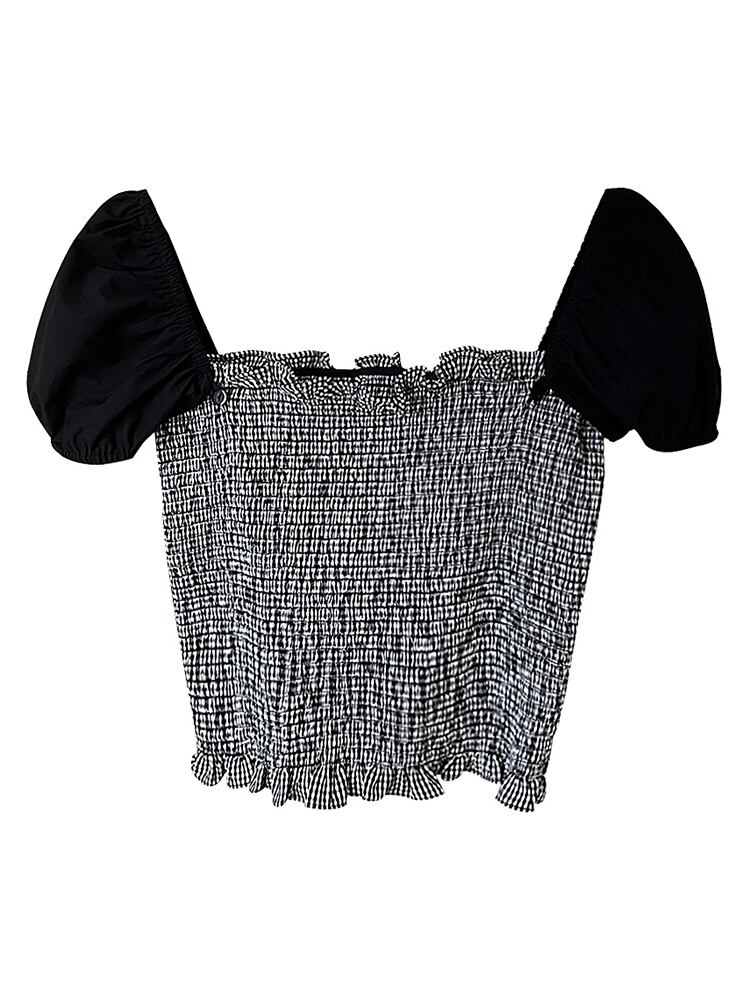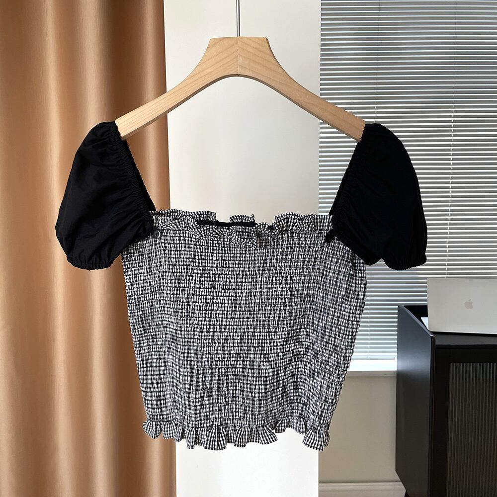 [EWQ] コントラストカラーチェック柄シャツ取り外し可能半袖スリムフィット夏潮弾性トップ 16Y9765 ショート ハーフスリーブ エラスティック 伸縮 サマー 夏物