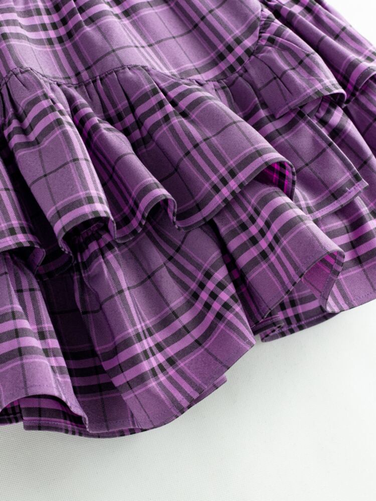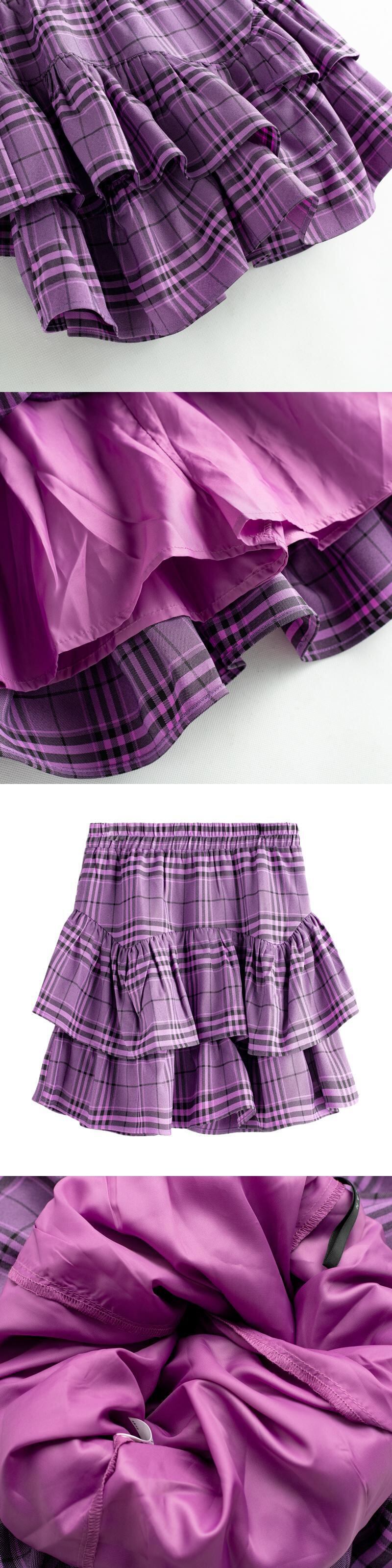 [EWQ] フリルスプライシング不規則 A ラインスカートコントラストパープルチェック柄ウエスト弾性スカート夏 6Y9907 エラスティック 伸縮 サマー 夏物 Aライン