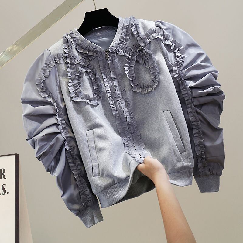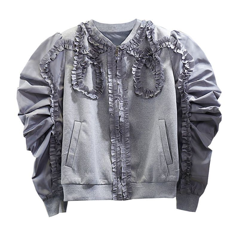 [EWQ] ストリートジッパー付きスウェットシャツ菌パッチワーク長袖ビッグサイズアウター秋潮ジップアップトップ ロング レッド オータム 秋物