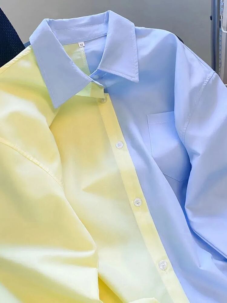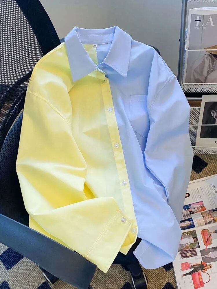 [EWQ] イエローブルーコントラストカラーシャツ長袖ルーズオーバーサイズシングルブレスト秋潮トップ 1045 ロング オータム 秋物