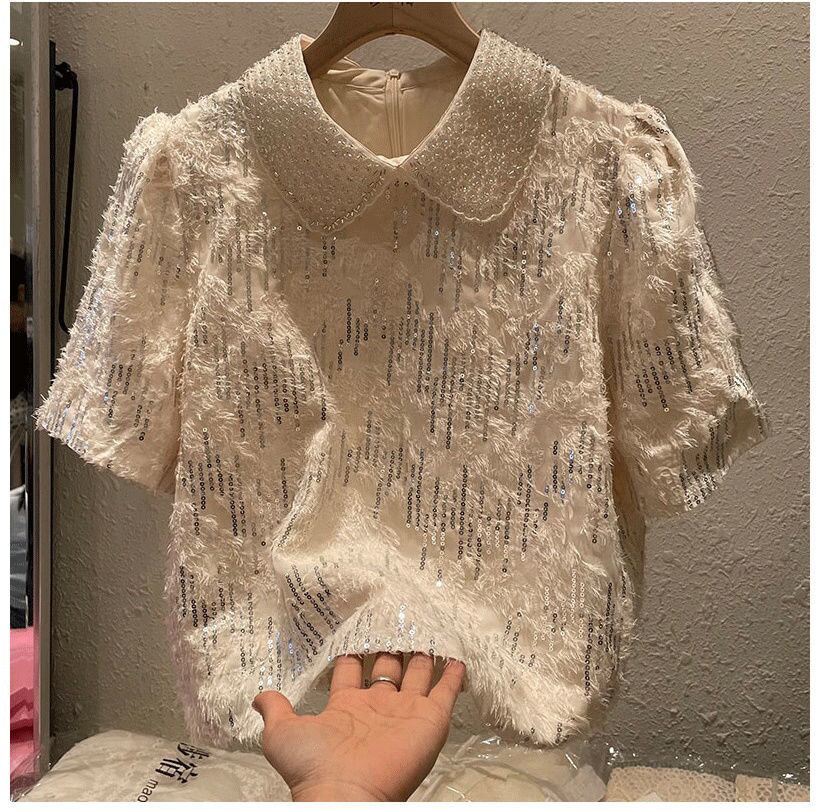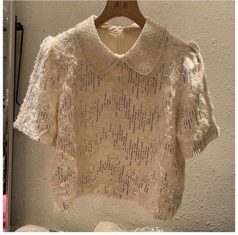 [EWQ] スパンコール装飾シャツビッグサイズルーズ半袖無地ラペル夏潮トップ 926 ショート ハーフスリーブ サマー 夏物 ソリッドカラー
