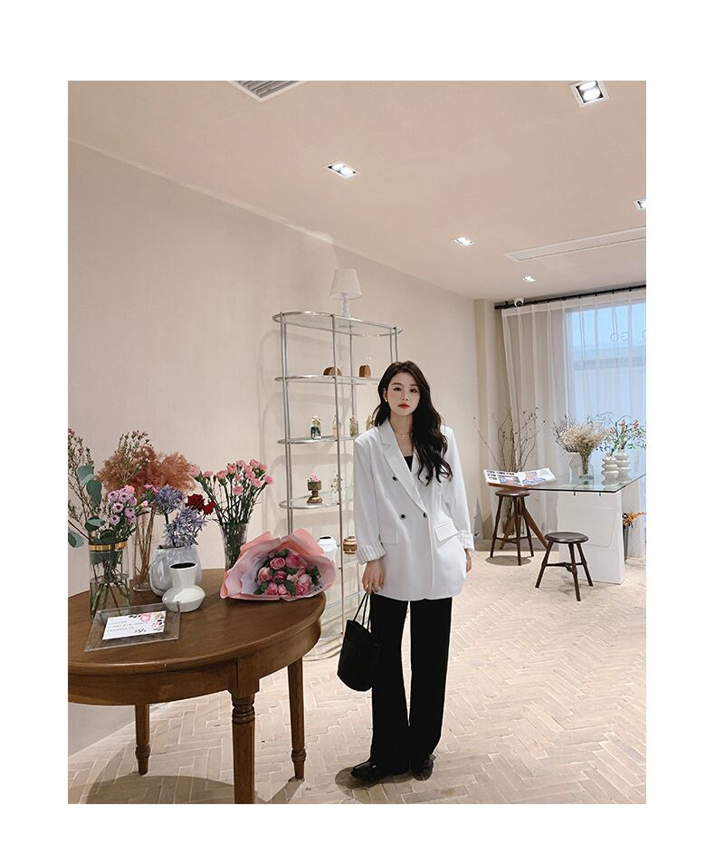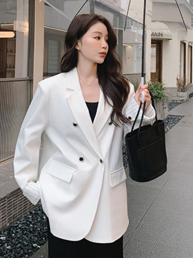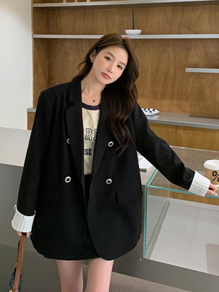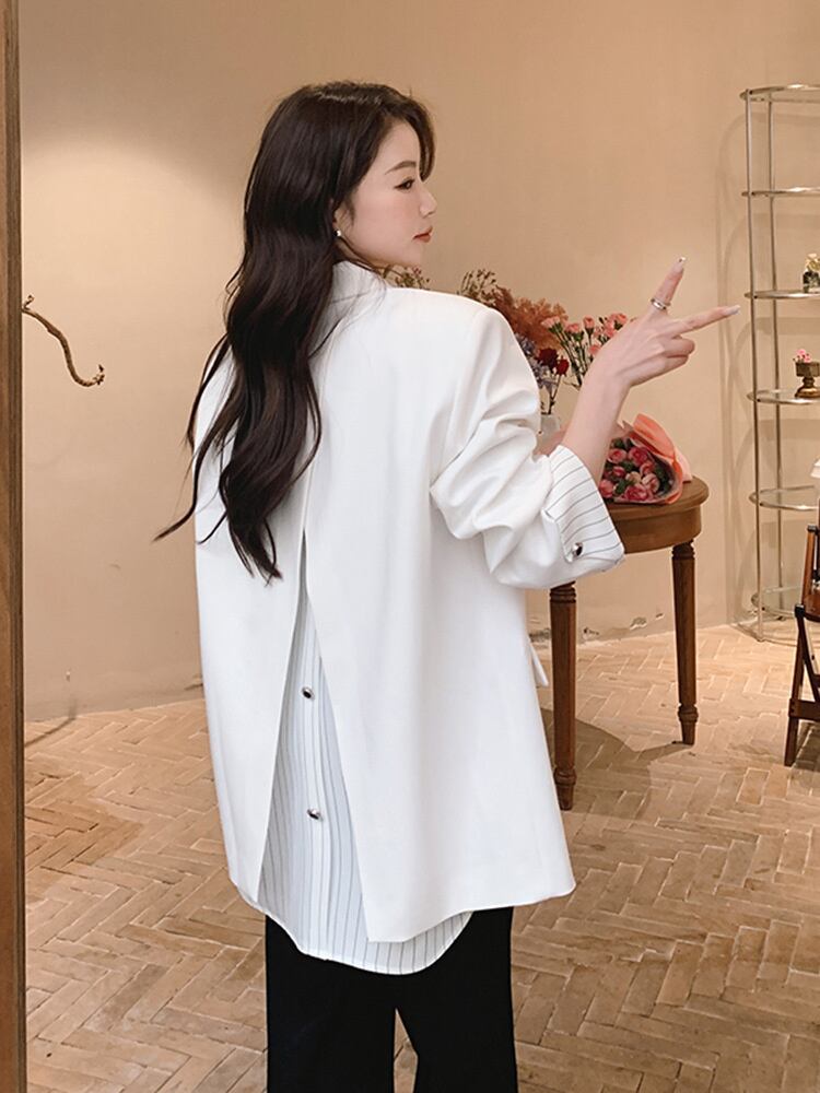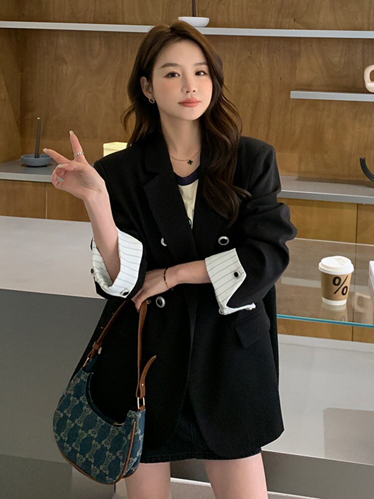 [EWQ] バックレススプリットパッチワークブレザーコートダブルブレストルーズ長袖スーツジャケット秋潮 ロング オータム 秋物