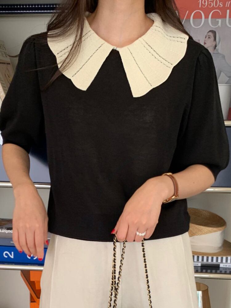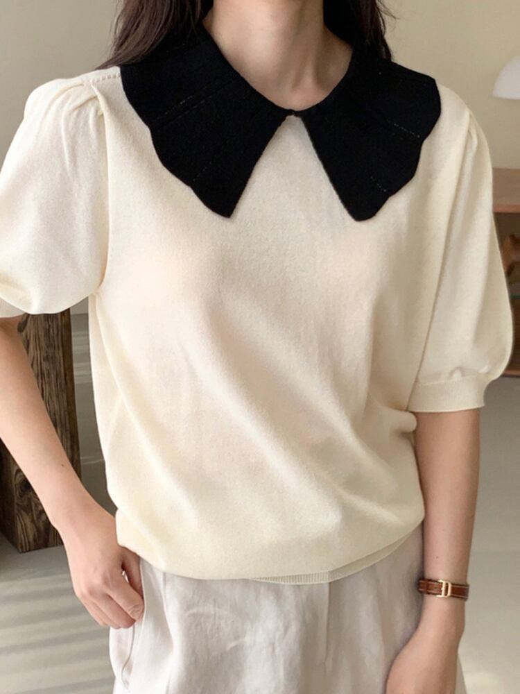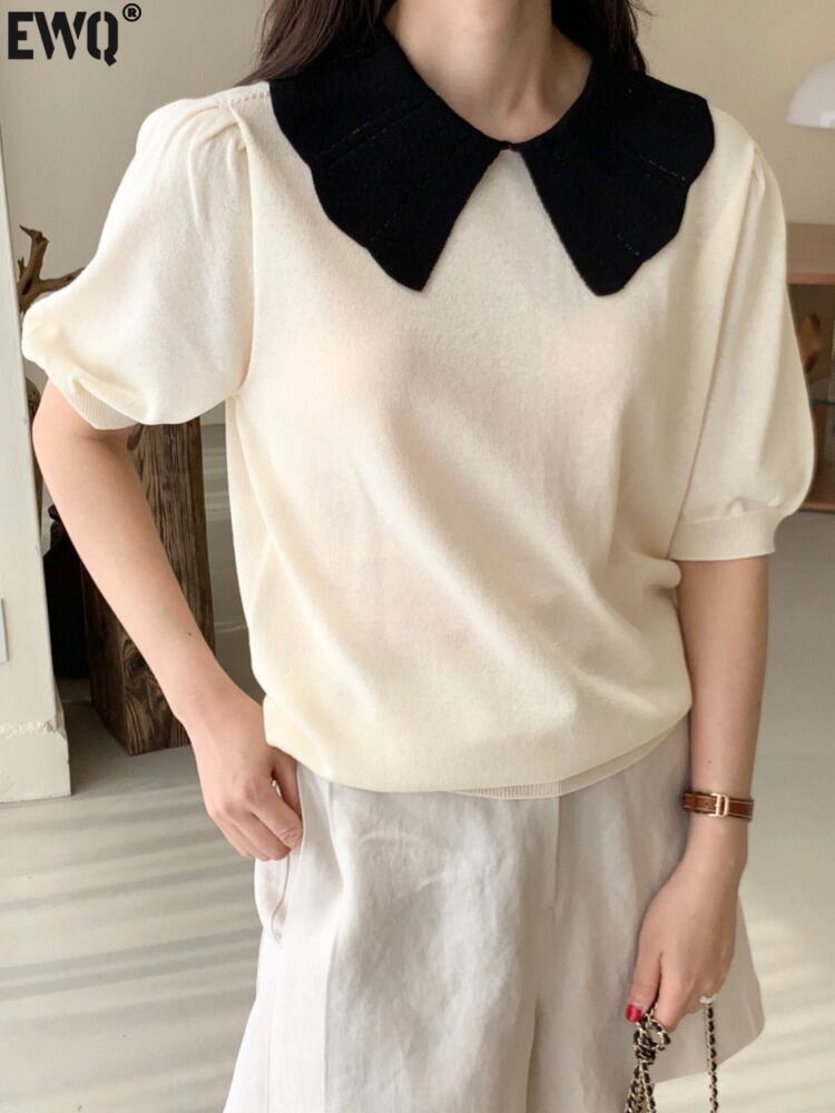 [EWQ] ラペルパッチワークコントラストセーター夏薄い潮半袖弾性ニットプルオーバートップ 6U909 ショート ハーフスリーブ エラスティック 伸縮 サマー 夏物