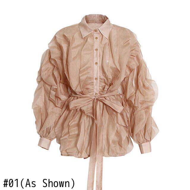 [EWQ] イレギュラーパッチワークシャツ レディース 秋 薄手ラペル シングルブレスト タイアップ ルーズトップ オータム 秋物