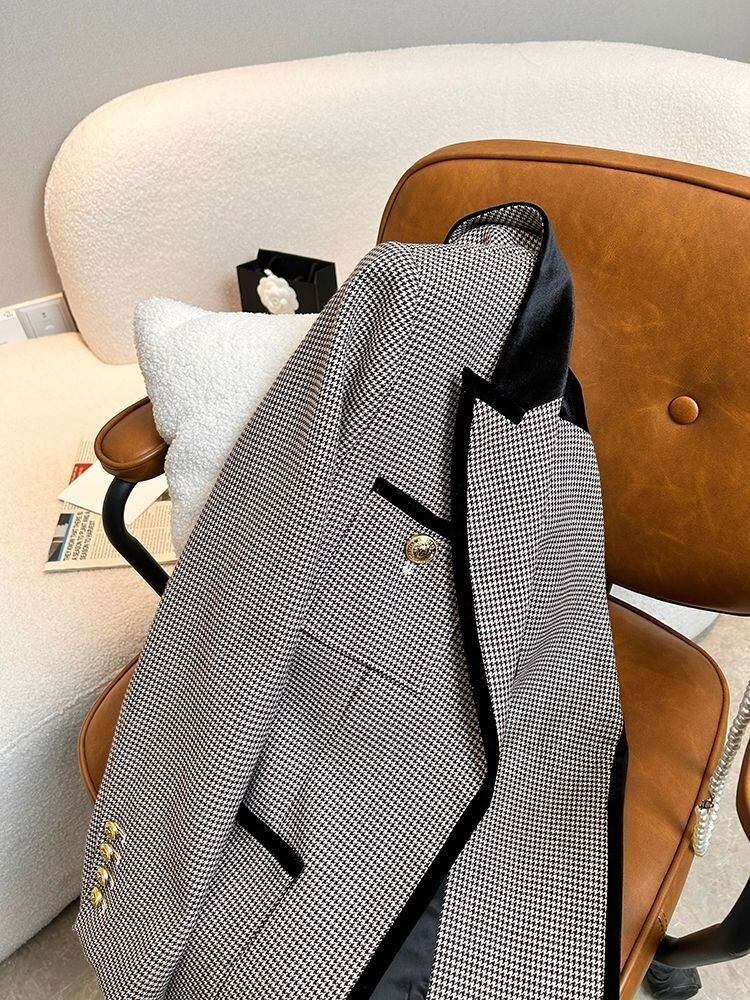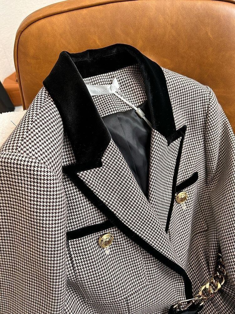 [EWQ] チェック柄ブレザーコート聖霊降臨祭チェーンベルト長袖ルーズビッグサイズスーツジャケットコントラストパッチ秋潮 ロング オータム 秋物 ハーネス
