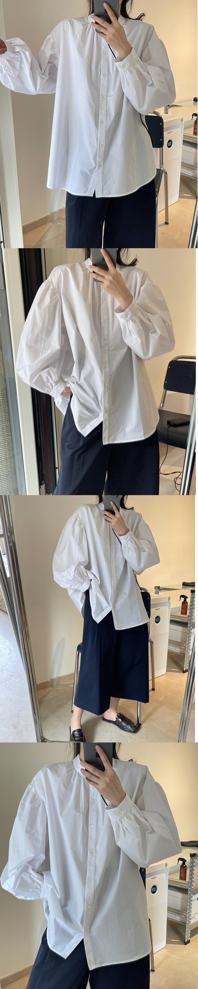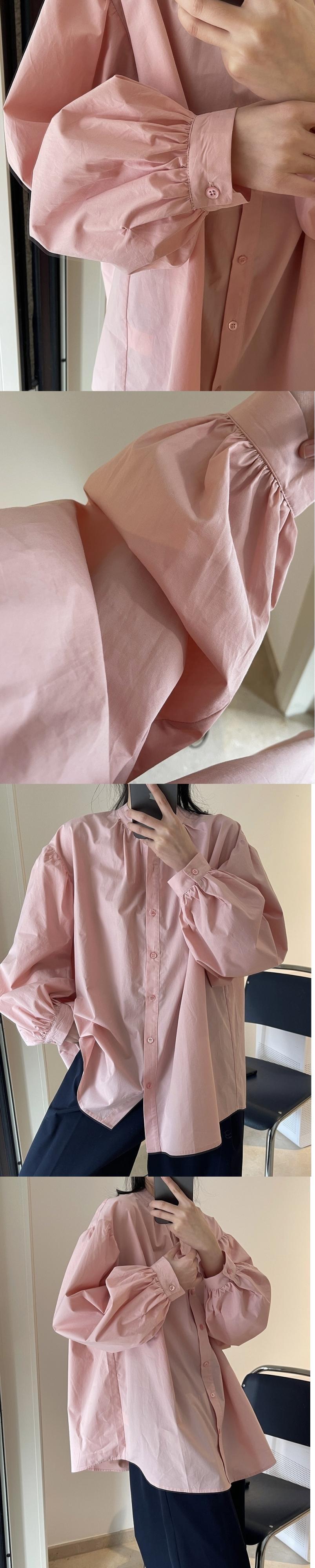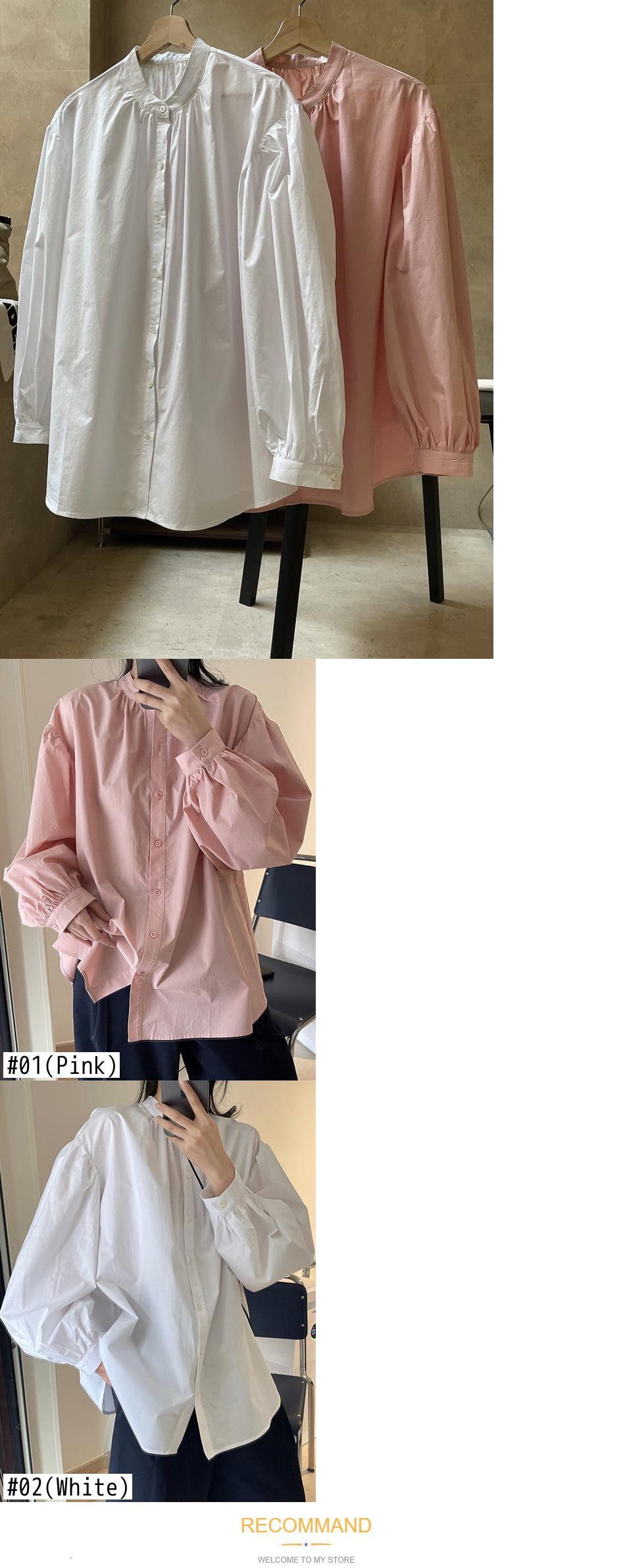 [EWQ] パフ長袖スタンドカラーシャツ ベーシックボタンブラウス 秋 ピンク トップス トレンド レディース ロング オータム 秋物