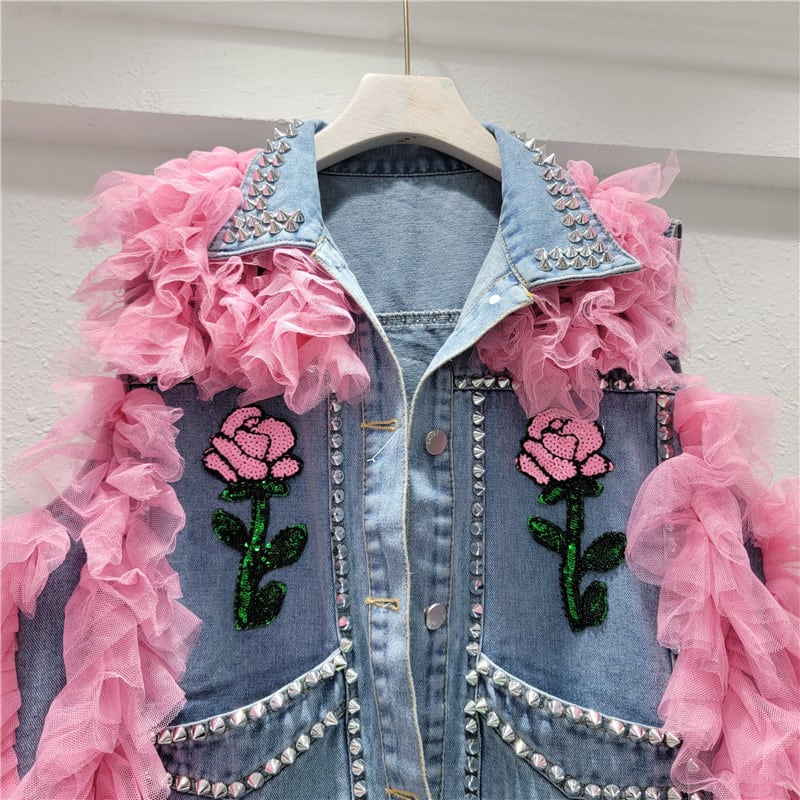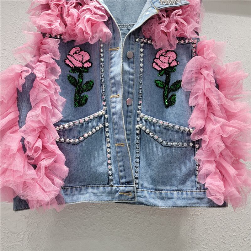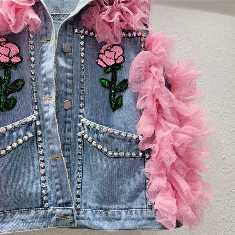 [EWQ] リベットラペルデニムベストストリートメッシュパッチワークノースリーブジャケット刺繍フラワーポケット夏潮トップ サマー 夏物 フラワーデザイン