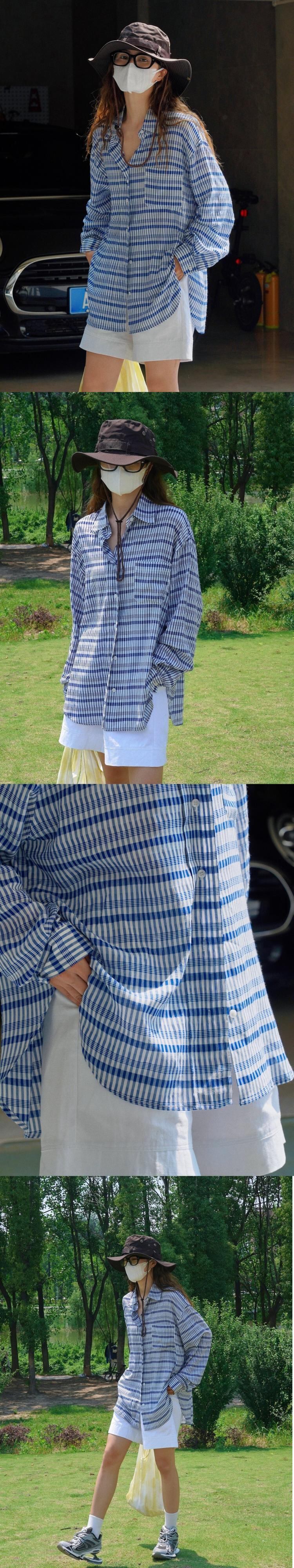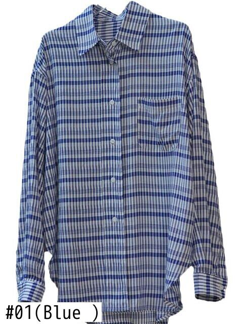 [EWQ] ブルー トップス チェック柄 ラペル シングルブレスト 長袖シャツ 秋潮 美しい レディース ストライプ ロング オータム 秋物