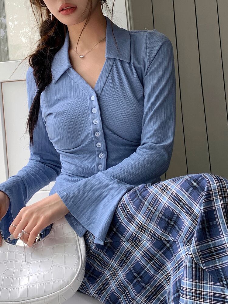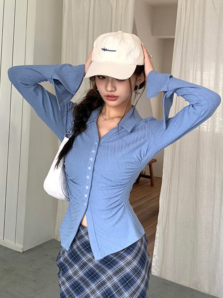 [EWQ] 長袖プリーツシャツシングルブレストスリムブラウストップ秋薄潮服 ロング オータム 秋物