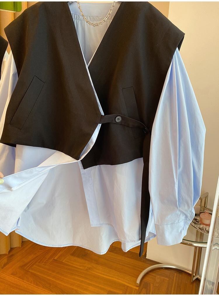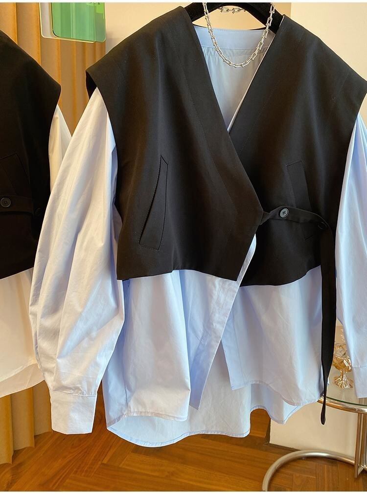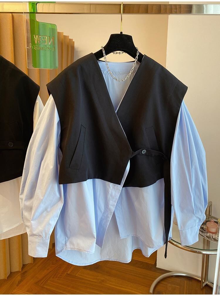 [EWQ] パッチワークフェイクツーピースシャツ長袖ルーズコントラストレースアップボタン秋潮トップス 16U919 ロング オータム 秋物